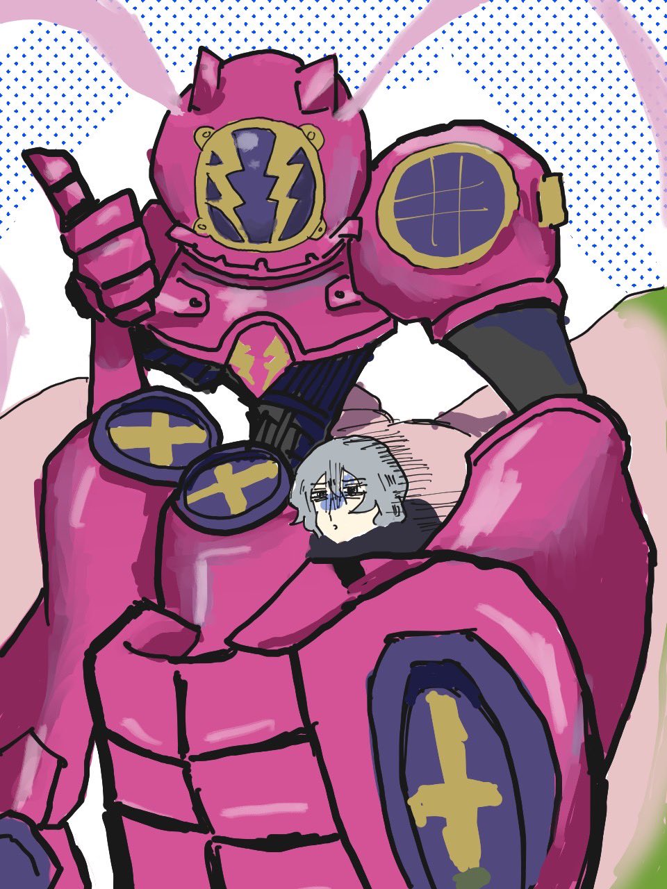 1boy 1girl amphimon android blue_eyes digimon digimon_ghost_game gynoid higashimitarai_kiyoshiro highres mecha_girl robot_girl short_hair size_difference white_hair