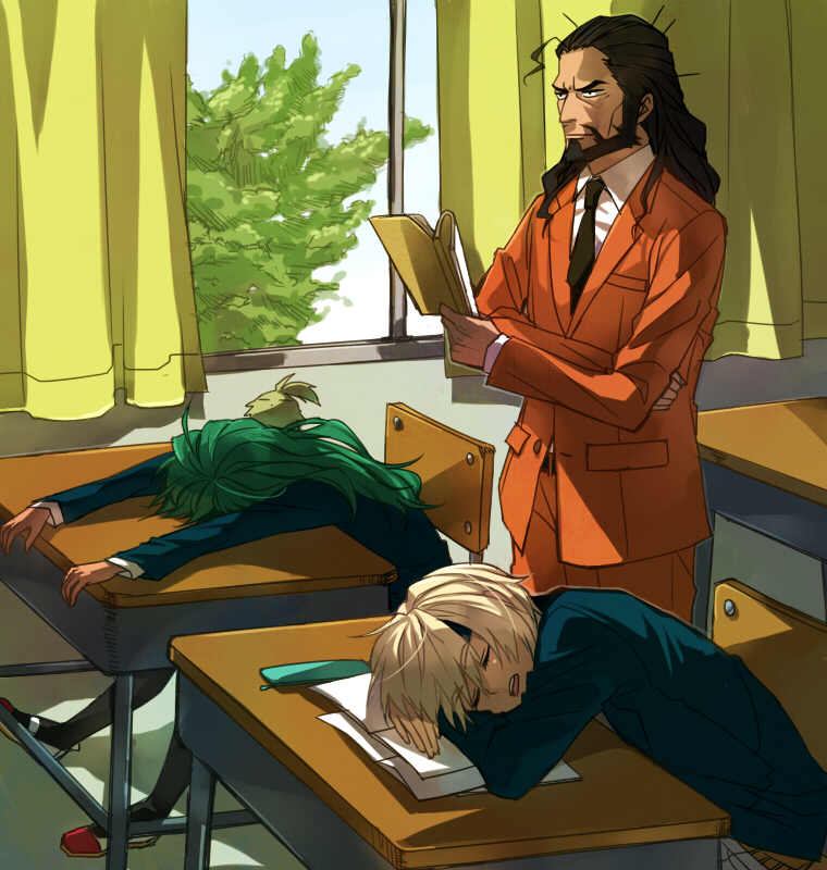 barda beard black_facial_hair black_hair blonde_hair book chair classroom curtains deltora_quest desk facial_hair filli green_hair holding holding_book indoors inlila jasmine_(deltora_quest) lief_(deltora_quest) long_hair long_sleeves messy_hair multiple_boys school school_chair school_desk school_uniform sitting sleeping teacher_and_student window