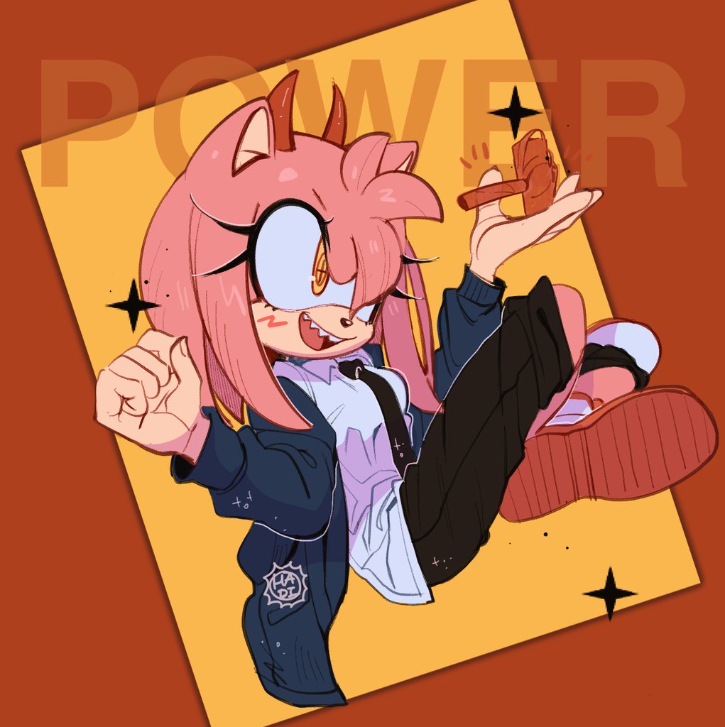 1girl 3mia_hadi3 :d amy_rose animal_nose black_necktie black_shorts blush chainsaw_man character_name cosplay cross-shaped_pupils full_body furry furry_female holding horns jacket necktie open_mouth orange_eyes power_(chainsaw_man) power_(chainsaw_man)_(cosplay) red_horns sharp_teeth shirt shorts smile solo sonic_(series) symbol-shaped_pupils teeth white_shirt