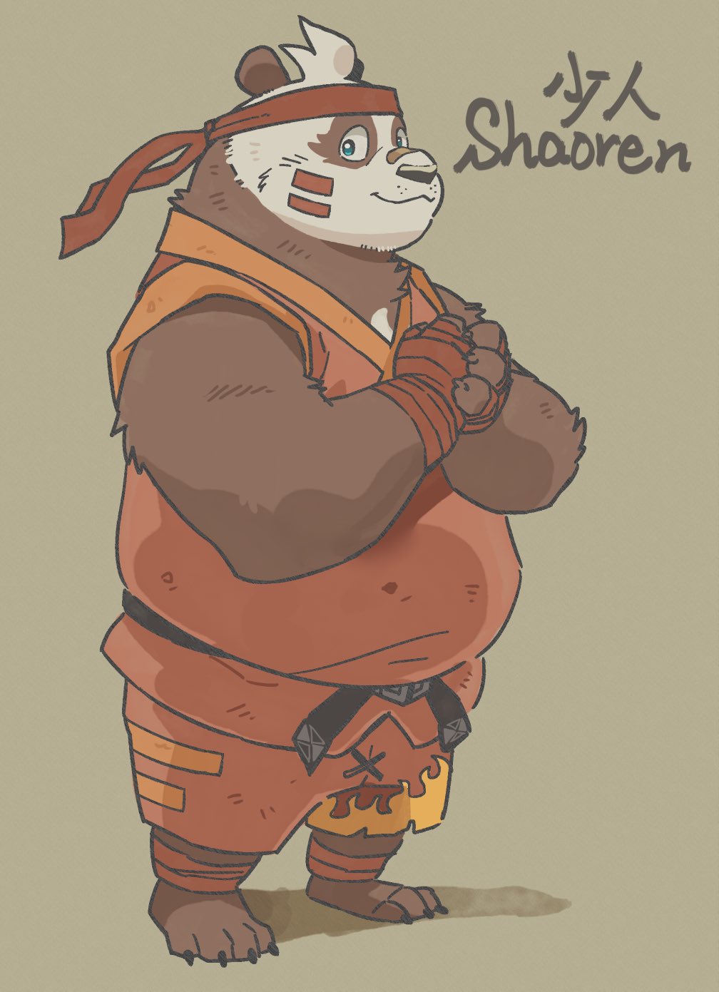 1boy animal_ears bara belt crave_saga dougi eye_black full_body furry furry_male garou-zuki highres male_focus panda_boy panda_ears shaoren_(crave_saga) short_hair smile solo