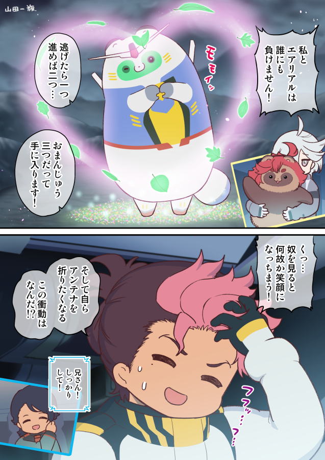 1boy 2koma 3girls animalization asticassia_school_uniform comic guel_jeturk gundam gundam_aerial gundam_suisei_no_majo hand_on_own_head heart leaf mecha mecha_pilot_suit miorine_rembran multicolored_hair multiple_girls normal_suit_(gundam) red_hair robot school_uniform space suletta_mercury sweat tanuki translation_request two-tone_hair upper_body white_hair yamada_ichizoku