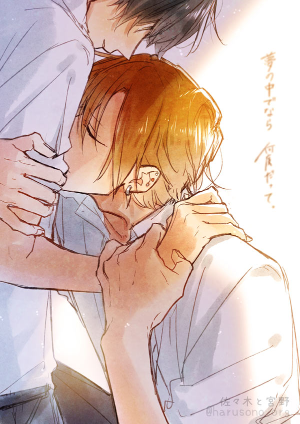 2boys artist_name black_hair black_pants brown_pants collared_shirt ear_piercing haruzono hug male_focus miyano_yoshikazu multiple_boys orange_hair pants piercing sasaki_shuumei sasaki_to_miyano school_uniform shirt translation_request twitter_username white_background white_shirt yaoi