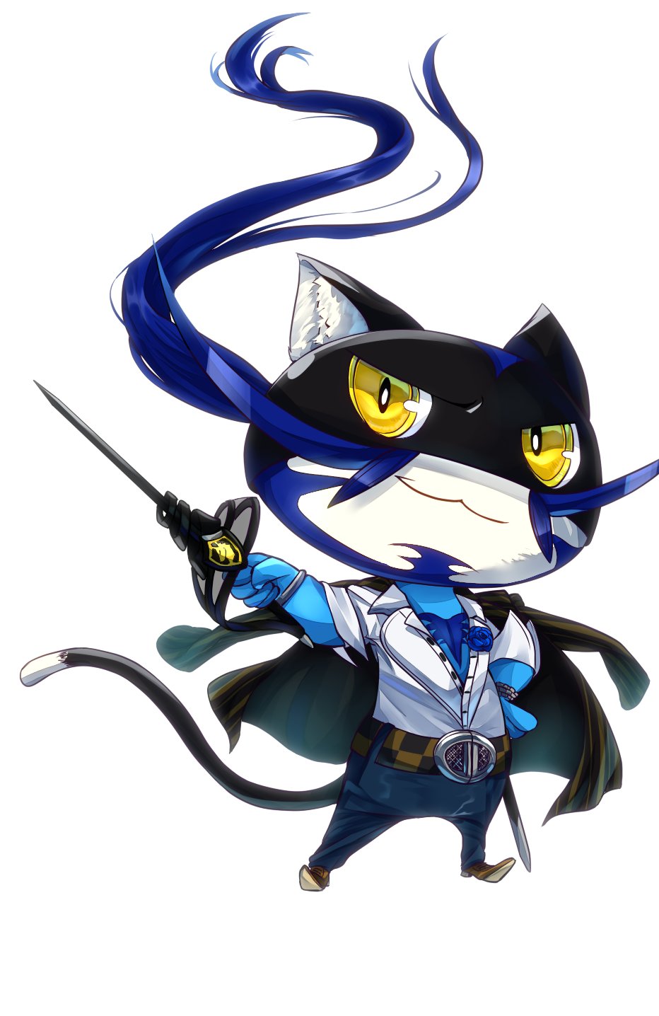 1boy belt cat cosplay denim diego_(persona_5) diego_(persona_5)_(cosplay) facial_hair goatee highres holding holding_weapon jeans lapel_pin morgana_(persona_5) mustache pancakesorting pants persona persona_5 persona_5_the_royal rapier sword weapon white_background yellow_eyes