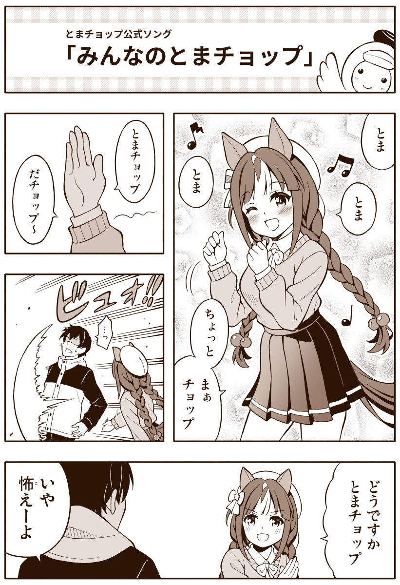 1boy 1girl amasawa_natsuhisa black_hair blush braid breasts casual clenched_hands comic commentary_request dodging faceless faceless_male highres hokko_tarumae_(umamusume) long_hair looking_at_viewer medium_breasts monochrome one_eye_closed open_mouth short_hair trainer_(umamusume) translation_request twin_braids umamusume