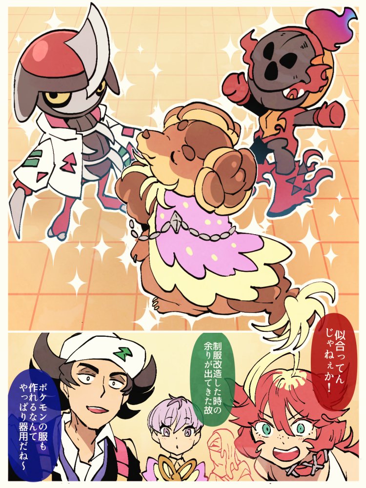 1girl 3boys ahoge atticus_(pokemon) baseball_cap bisharp black_eyes black_hair blonde_hair boots charcadet collar comic dachsbun freckles gen_5_pokemon giacomo_(pokemon) green_eyes grey_eyes grey_hair hat maruboku mela_(pokemon) multicolored_hair multiple_boys nintendo orange_collar ortega_(pokemon) pokemon pokemon_(creature) pokemon_scarlet_and_violet red_hair short_hair smile sparks speech_bubble team_star two-tone_hair