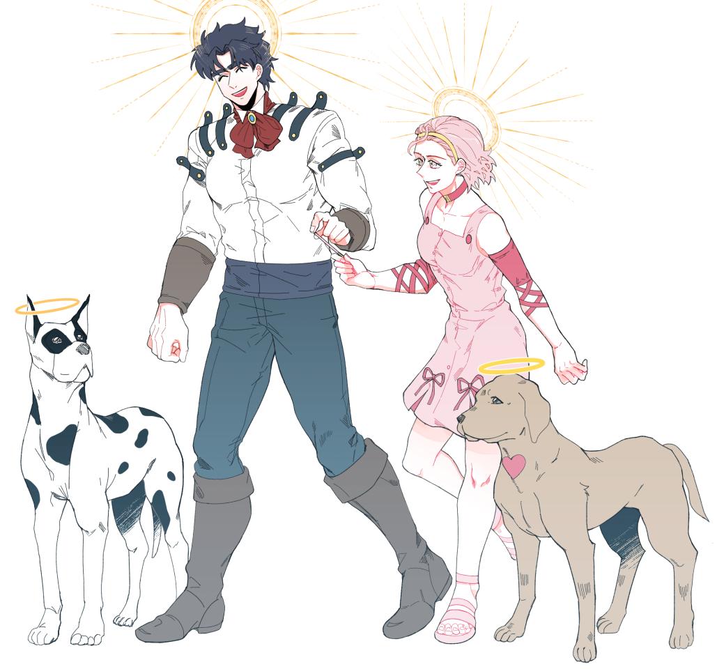 1boy 1girl arm_warmers arnold_(jojo) ashblanc195 bare_shoulders blue_hair boots choker closed_eyes danny_(jojo) diamond_wa_kudakenai dog dress food full_body hairband halo holding holding_food holding_pocky jojo_no_kimyou_na_bouken jonathan_joestar phantom_blood pink_dress pink_hair pocky short_hair smile sugimoto_reimi