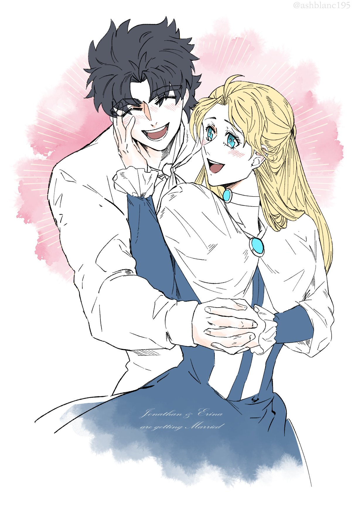 1boy 1girl ashblanc195 blonde_hair blue_eyes blue_hair blush capelet choker closed_eyes couple dress english_text erina_pendleton hand_on_another's_face happy hetero highres holding_hands hug husband_and_wife interlocked_fingers jojo_no_kimyou_na_bouken jonathan_joestar long_hair long_sleeves phantom_blood smile