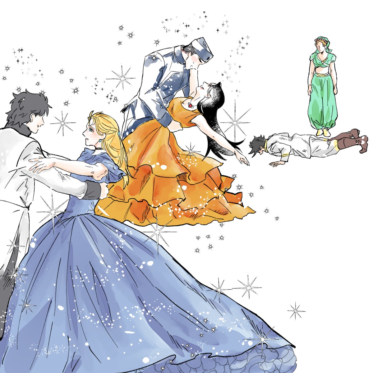 3boys 3girls ashblanc195 battle_tendency blonde_hair blue_dress blue_hair brown_hair couple dancing dress erina_pendleton george_joestar_ii hat hetero highres husband_and_wife jojo_no_kimyou_na_bouken jonathan_joestar joseph_joestar joseph_joestar_(young) lisa_lisa long_hair multiple_boys multiple_girls orange_dress phantom_blood smile sparkle suzi_q sweatdrop
