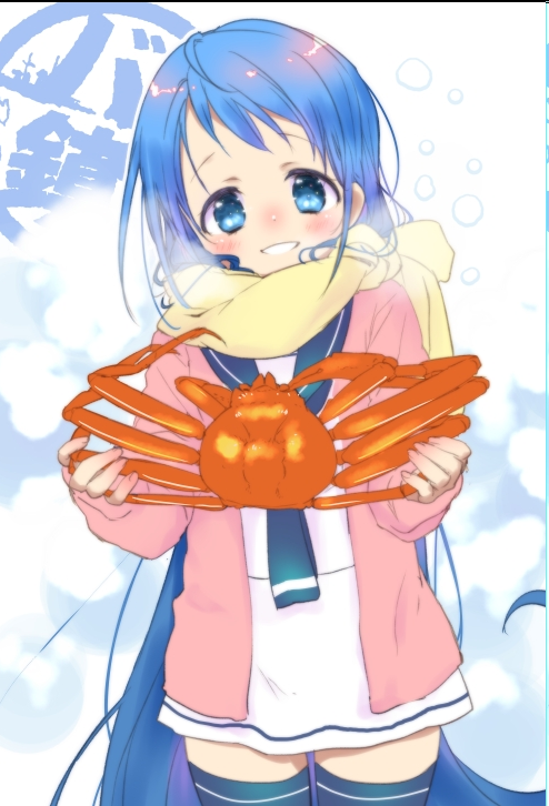 1girl blue_eyes blue_hair blue_neckerchief blue_sailor_collar blue_thighhighs cardigan cowboy_shot crab gradient_hair holding kantai_collection long_hair looking_at_viewer malino_(dream_maker) multicolored_hair neckerchief open_cardigan open_clothes pink_cardigan sailor_collar samidare_(kancolle) scarf school_uniform serafuku smile solo swept_bangs thighhighs very_long_hair white_sailor_collar yellow_scarf