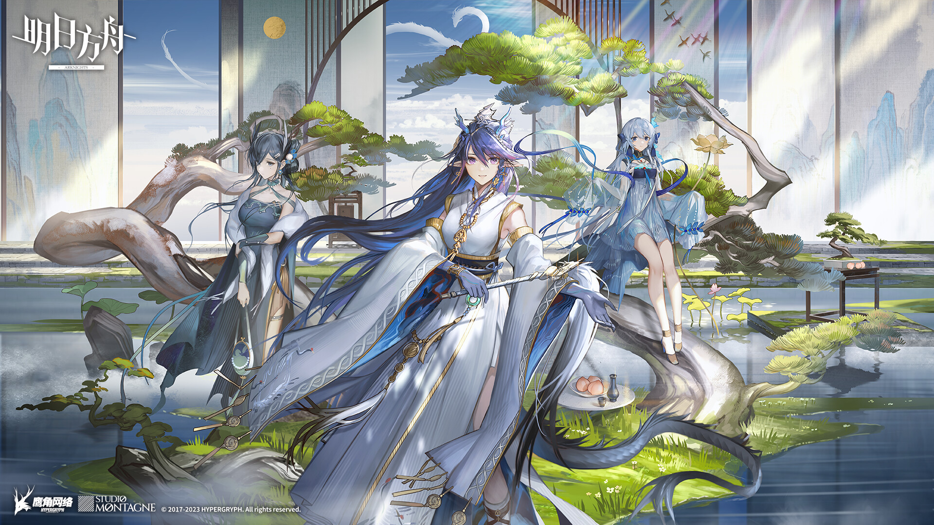 3girls arknights bag black_hair blue_eyes blue_hair bottle braid cantabile_(arknights) cantabile_(illumination_that_of_daylights)_(arknights) china_dress chinese_clothes cup dress drinking_glass food fruit grey_hair hair_ornament highres horns ling_(arknights) ling_(it_does_wash_the_strings)_(arknights) long_hair looking_at_viewer mulberry_(arknights) mulberry_(reflection_that_of_the_moons)_(arknights) multiple_girls official_art peach pointy_ears tree wine_bottle wine_glass