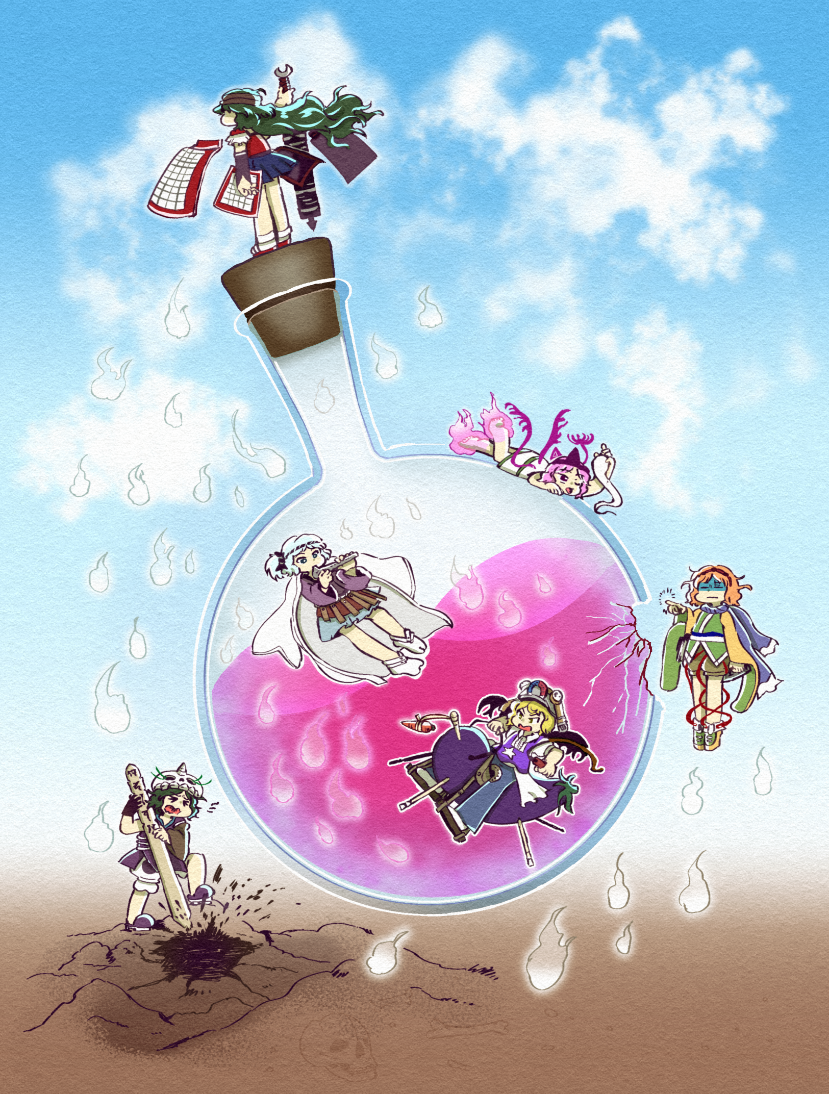 >_< 5others androgynous armor black_gloves blonde_hair blue_eyes blue_hair blue_hakama blue_pants blue_skirt blue_sky bright_pupils brown_shorts brown_sleeves chikafumikou closed_eyes closed_mouth collared_shirt commentary_request day detached_sleeves dress eggplant fingerless_gloves floating frills fujiwara_no_iyozane gloves green_hair green_kimono green_shoes grey_hair grey_headwear hairband hakama hakama_short_skirt hakama_skirt helmet highres hitodama japanese_clothes kimono kitsugai_sese leg_ribbon len'en light_blue_hair long_hair long_sleeves magnet multiple_others no_shoes one_eye_closed open_mouth orange_hair orange_sleeves other_focus pants pink_hair purple_eyes purple_kimono purple_slippers purple_vest reactivate_majestical_imperial red_hairband red_ribbon ribbon shield shion_(len'en) shirt shoes short_hair short_sleeves shorts shoulder_armor side_ponytail single_detached_sleeve single_fingerless_glove single_glove skirt skull_on_head sky slippers socks star_(symbol) star_print taira_no_fumikado triangular_headpiece turn_pale umatachi_tsugumi vest white_dress white_pupils white_shirt white_shorts white_socks yellow_eyes zuifeng_tenkai