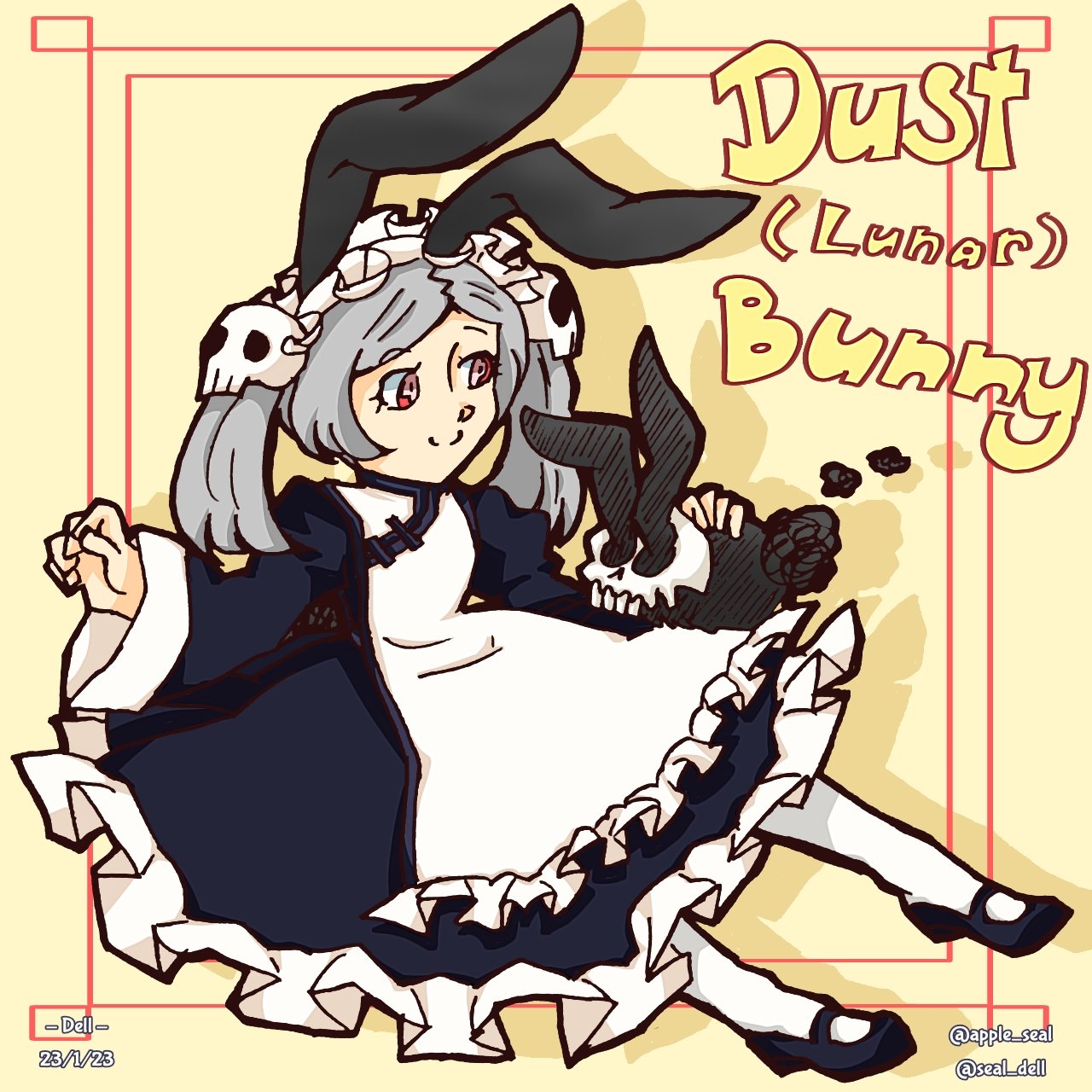 1girl adapted_costume apple_seal apron bloody_marie_(skullgirls) chinese_new_year dress dust_bunny_(skullgirls) frilled_apron frilled_dress frills grey_hair hair_ornament highres maid_headdress mask pantyhose rabbit red_eyes skull skull_hair_ornament skullgirls smile solo twintails