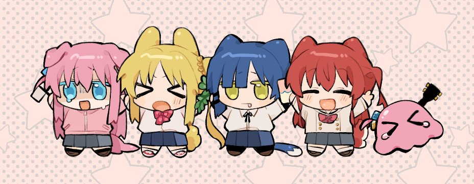 >_< 4girls animal_ears black_ribbon black_skirt black_socks blonde_hair blue_eyes blue_hair blush bocchi_the_rock! bow brown_footwear cat_ears cat_girl chibi chinese_commentary collared_shirt commentary_request dog_ears dog_tail gotoh_hitori gotoh_hitori_(octopus) grass grey_skirt halftone halftone_background holding_grass ijichi_nijika jacket kemonomimi_mode kita_ikuyo long_hair multiple_girls neck_ribbon one_side_up pantyhose pink_hair pink_jacket pinkroll1280 pleated_skirt rabbit_ears rabbit_tail red_bow red_hair ribbon school_uniform shirt shirt_tucked_in short_hair side_ponytail skirt socks star_(symbol) star_symbol_background sweat tail tears track_jacket v white_shirt yamada_ryo yellow_eyes