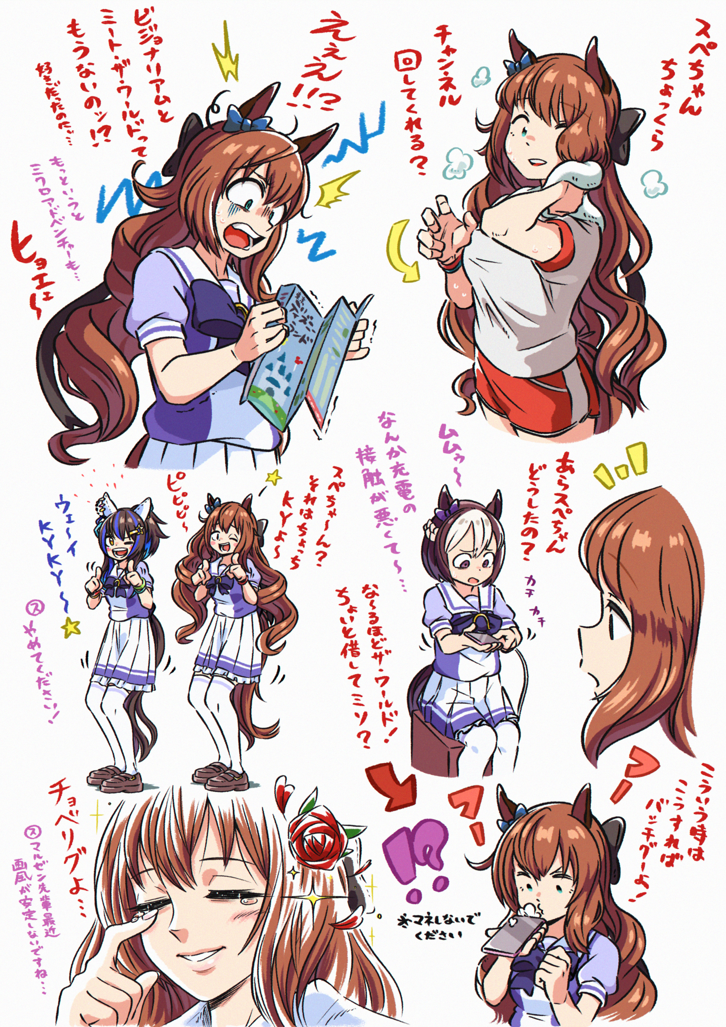 !? 3girls ;d ^^^ absurdres animal_ears appleq arrow_(symbol) black_bow blowing blue_hair bow braid brown_footwear brown_hair cellphone charger commentary_request daitaku_helios_(umamusume) flower green_eyes grey_background gym_shirt gym_shorts gym_uniform hair_bow hair_flower hair_ornament highres holding holding_phone horse_ears horse_girl horse_tail loafers long_hair maruzensky_(umamusume) multicolored_hair multiple_girls notice_lines one_eye_closed one_side_up open_mouth petals phone pleated_skirt pointing puckered_lips puffy_short_sleeves puffy_sleeves purple_eyes purple_shirt red_flower red_rose red_shorts rose rose_petals school_uniform shirt shoes short_hair short_shorts short_sleeves shorts simple_background skirt smile special_week_(umamusume) star_(symbol) streaked_hair sweat tail thighhighs towel towel_around_neck tracen_school_uniform translation_request two-tone_hair umamusume very_long_hair white_hair white_shirt white_skirt white_thighhighs wide-eyed