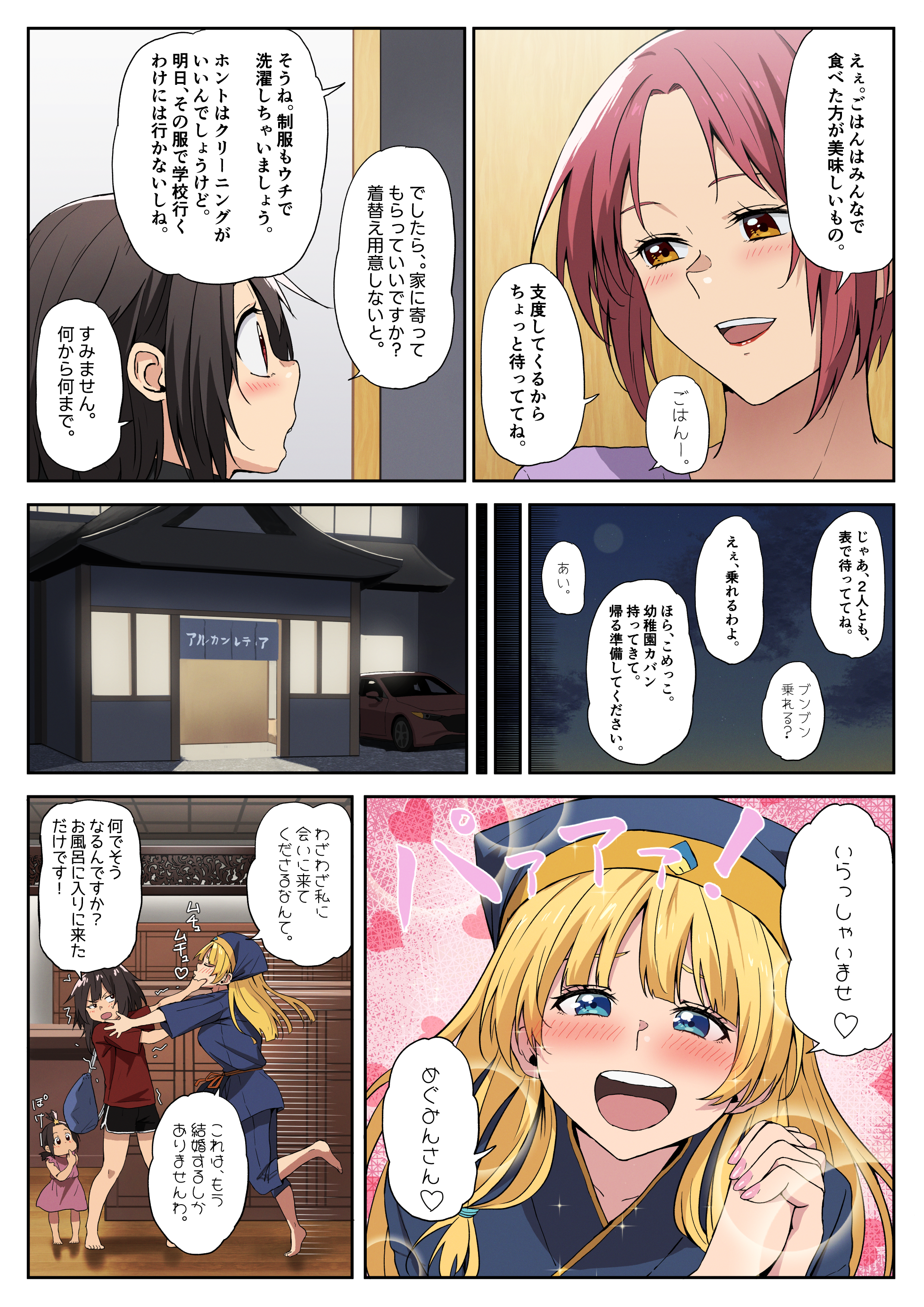 4girls :d absurdres blonde_hair blue_eyes brown_hair cecily_(konosuba) comic contemporary highres izawa_(bhive003) japanese_clothes komekko kono_subarashii_sekai_ni_shukufuku_wo! lipstick makeup megumin multiple_girls nail_polish open_mouth orange_eyes own_hands_together red_hair short_hair smile translated wolbach
