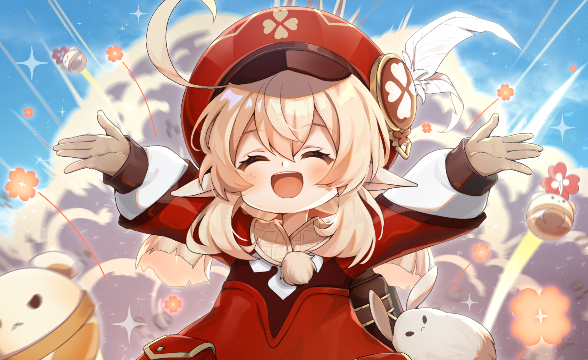 1girl :d ^_^ ahoge arms_up blonde_hair blue_sky blush child closed_eyes dodoco_(genshin_impact) explosion facing_viewer genshin_impact hat highres jumpy_dumpty klee_(genshin_impact) koki_(latte1023) long_sleeves open_mouth outdoors pointy_ears red_hat red_shirt shirt sky smile solo upper_body