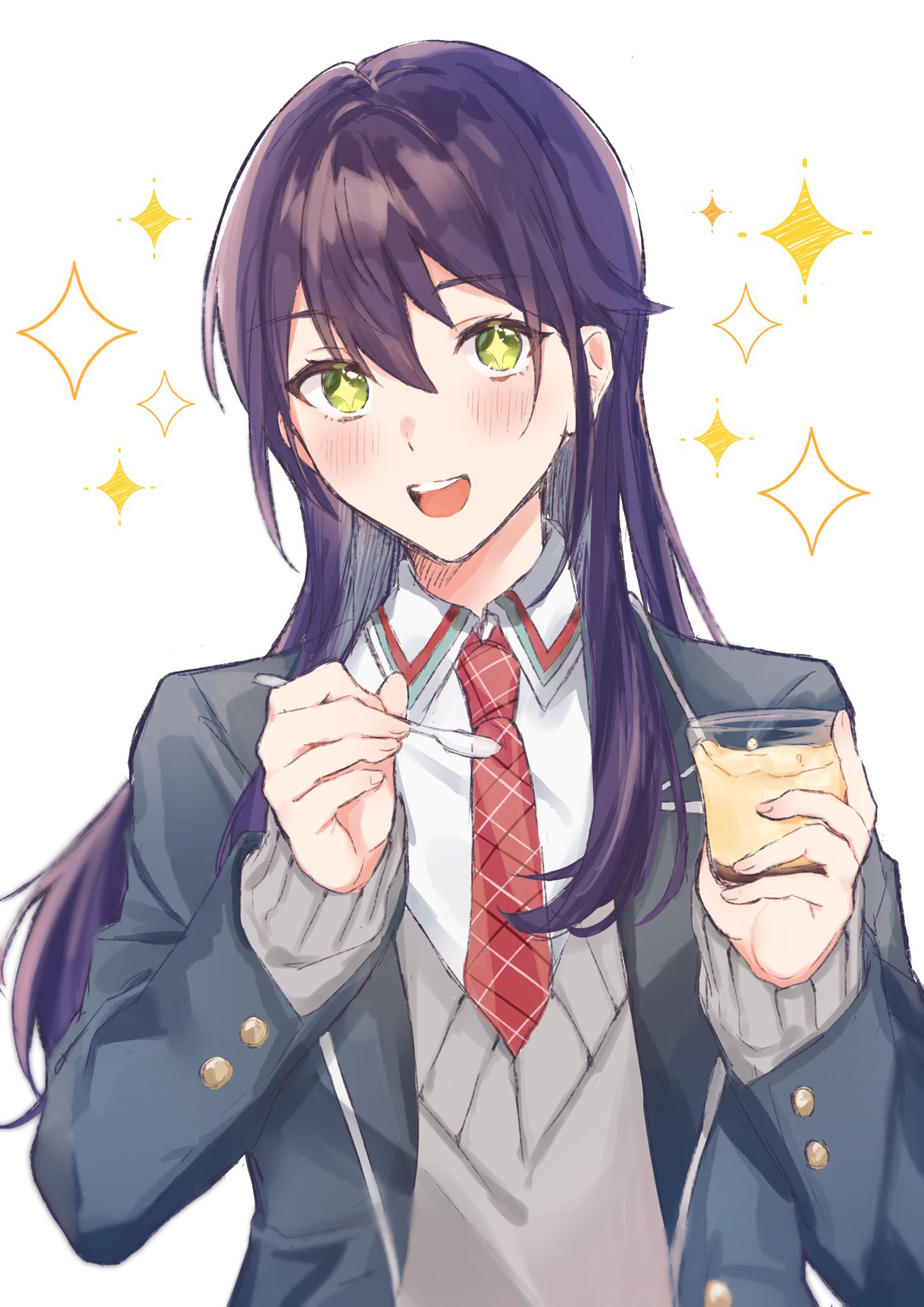 +_+ 1girl :d black_jacket blazer blush collared_shirt food genderswap genderswap_(mtf) green_eyes grey_sweater hair_between_eyes highres holding holding_spoon jacket kenmochi_touya kenmochi_touya_(1st_costume) long_hair long_sleeves looking_at_viewer necktie nijisanji open_clothes open_jacket open_mouth pudding purple_hair red_necktie school_uniform shirt simple_background sleeves_past_wrists smile solo sparkle spoon sweater tsumetsume_zerii upper_body very_long_hair virtual_youtuber white_background white_shirt