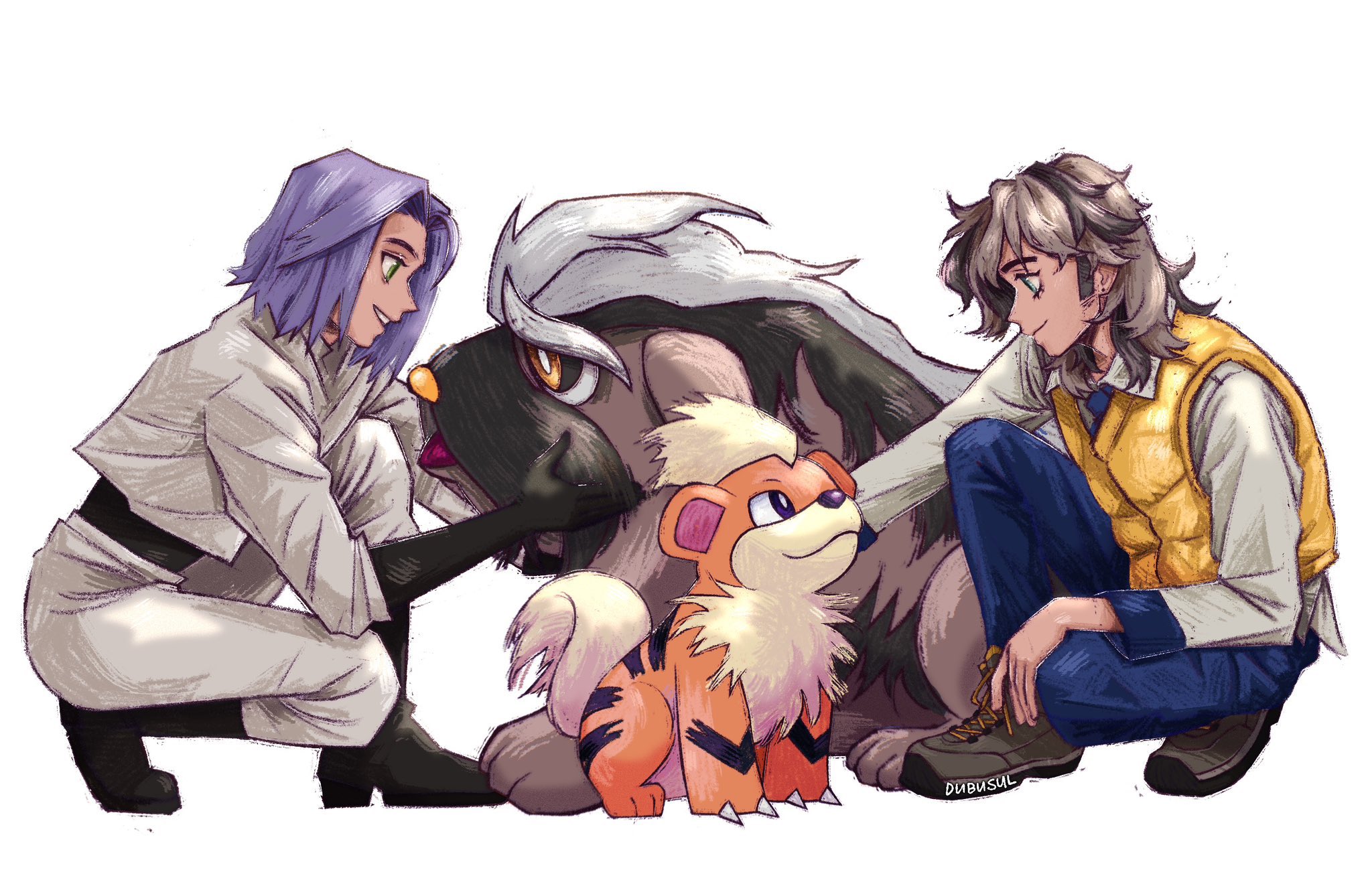 2boys arven_(pokemon) dubusul gen_1_pokemon growlithe highres james_(pokemon) multiple_boys nintendo pokemon pokemon_(anime) pokemon_(creature) pokemon_scarlet_and_violet white_background