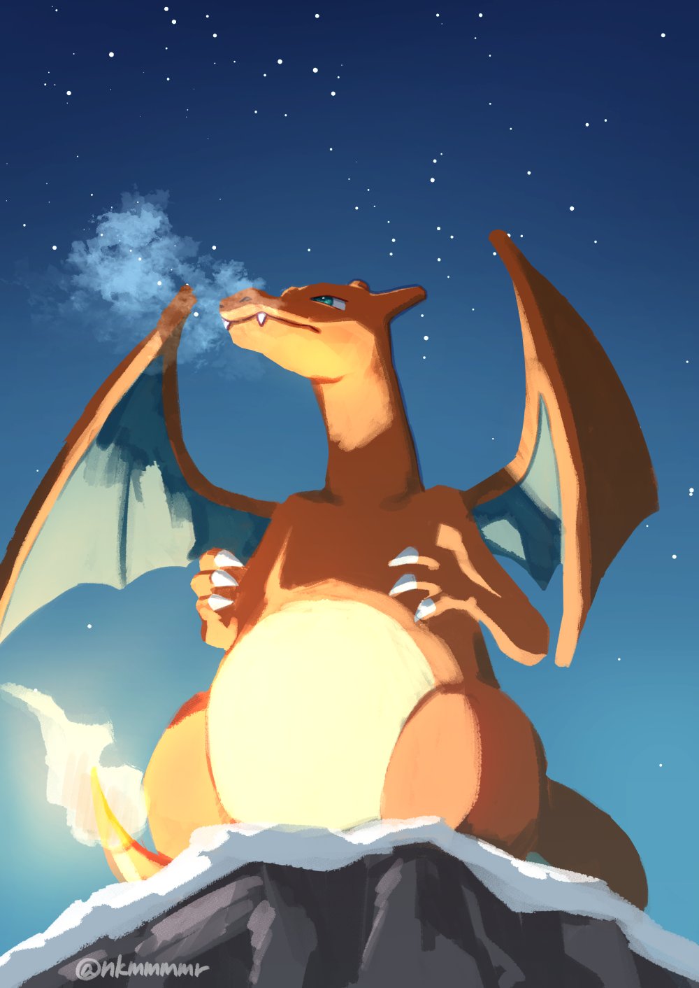 breath charizard claws commentary_request fangs fangs_out fire flame-tipped_tail from_below funahashi_(nkmmmmr) gen_1_pokemon highres looking_up night nintendo no_humans outdoors pokemon pokemon_(creature) sky solo star_(sky) tail twitter_username watermark