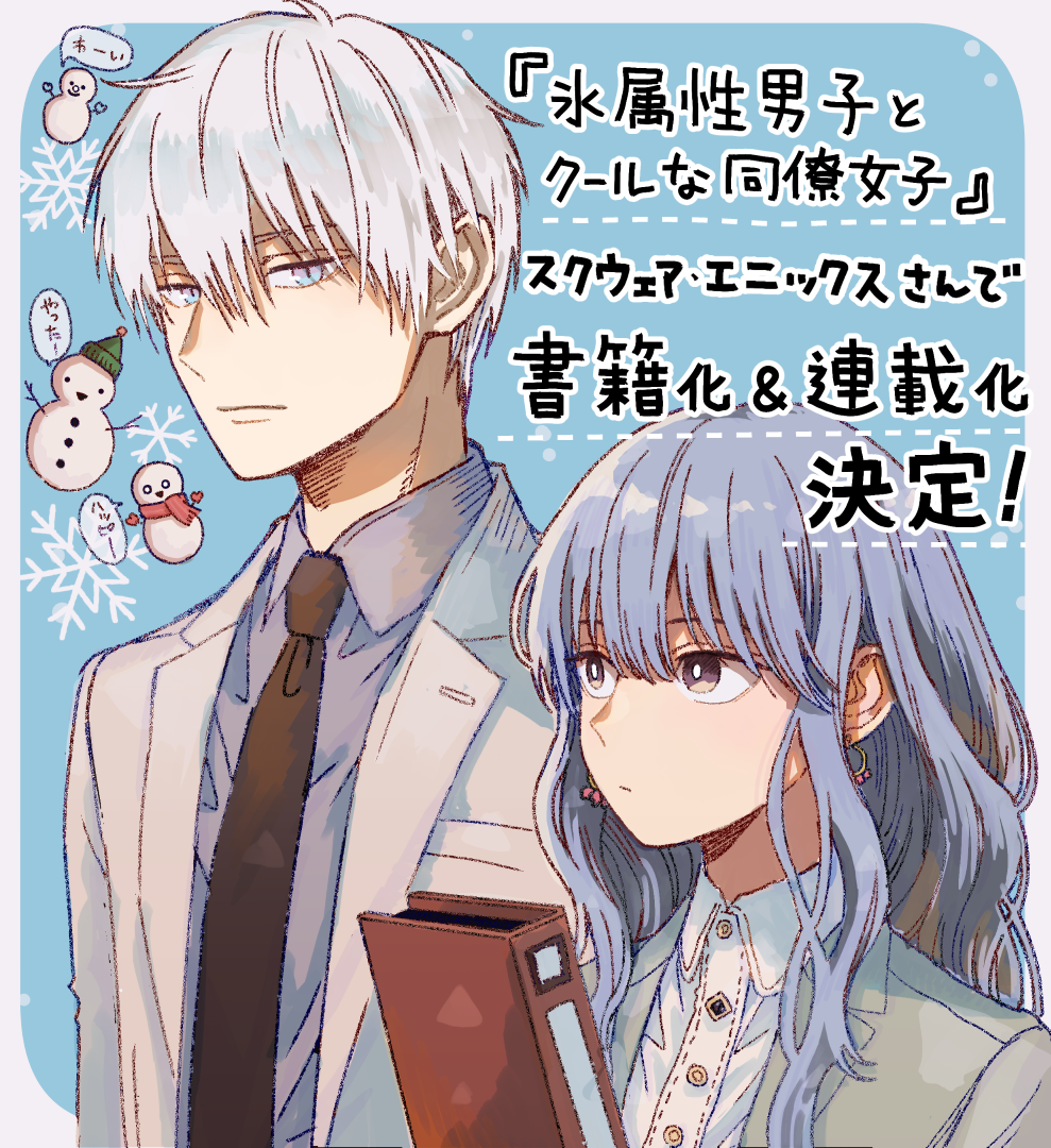 1boy 1girl :| alternate_hair_color black_necktie blue_background blue_eyes blue_hair border bright_pupils brown_eyes buttons closed_mouth collared_shirt copyright_name dotted_line earrings expressionless eye_contact eyebrows_hidden_by_hair from_side fuyutsuki_mio gradient_eyes grey_border grey_shirt hair_between_eyes himuro_yukiya jacket jewelry koori_zokusei_danshi_to_cool_na_douryou_joshi lapels light_blue_hair long_hair long_sleeves looking_at_another looking_to_the_side multicolored_eyes necktie notched_lapels official_art outside_border rounded_corners shirt slit_pupils snowflake_background snowflakes snowman speech_bubble suit_jacket tonogaya upper_body wavy_hair white_hair white_jacket white_pupils wing_collar