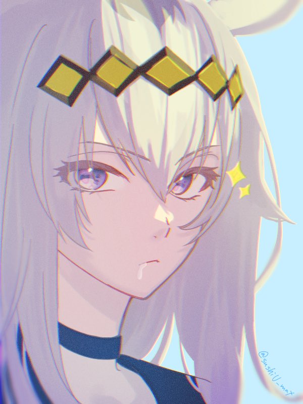 1girl animal_ears blue_background blue_eyes close-up closed_mouth commentary_request drooling expressionless grey_hair hair_between_eyes hair_ornament horse_ears horse_girl kadokura_(sushiu_max) long_hair looking_at_viewer multicolored_hair oguri_cap_(starlight_beat)_(umamusume) oguri_cap_(umamusume) portrait simple_background solo sparkle twitter_username umamusume