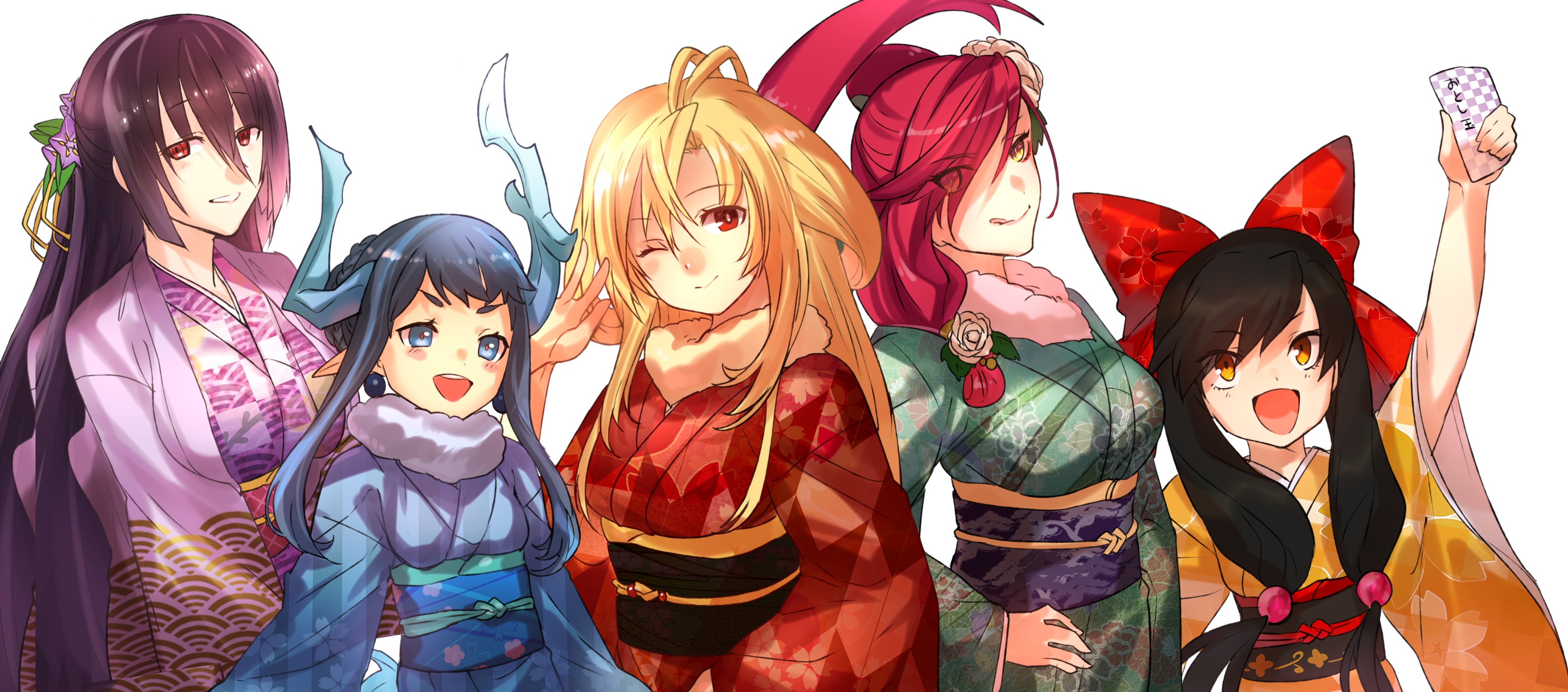 absurdres antenna_hair arms_at_sides black_hair blonde_hair blue_eyes blue_hair bow chiganemaru_(tenka_hyakken) dragon_horns floral_print flower fur_collar furiwakegami_hiromitsu hair_bow hair_flower hair_ornament hand_on_own_hip hand_up haori highres holding horns japanese_clothes kimono low_twintails mutsu-no-kami_yoshiyuki_(tenka_hyakken) namioyogi_kanemitsu obi obiage obijime onasu_(sawagani) one_eye_closed onikiri_yasutsuna otoshidama pointy_ears ponytail raised_eyebrows red_eyes red_hair sash smile tenka_hyakken tongue tongue_out twintails v-shaped_eyebrows yellow_eyes