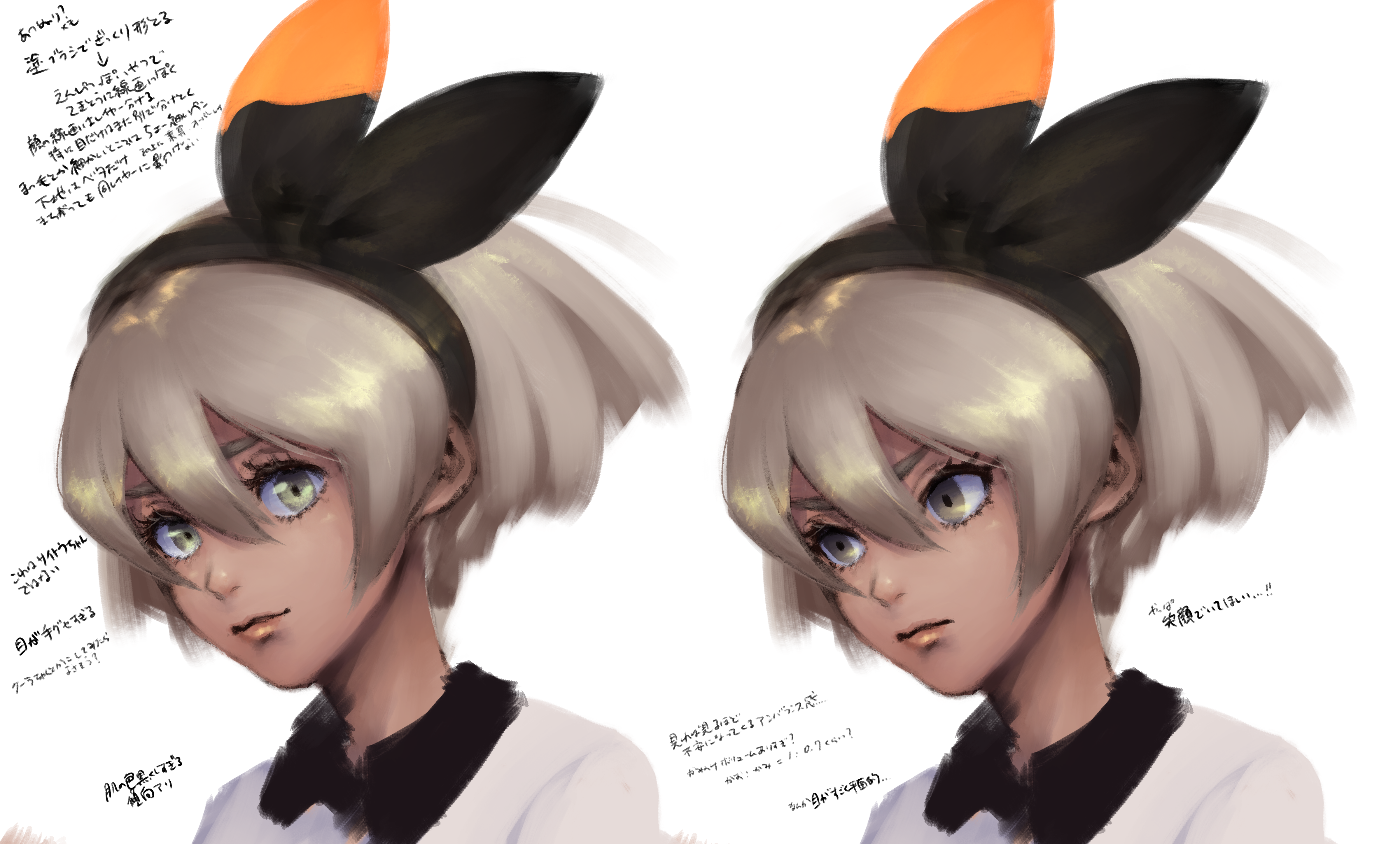 1girl absurdres bea_(pokemon) black_hairband blonde_hair bow_hairband closed_mouth commentary_request eyelashes hair_between_eyes hairband hasekou_g highres looking_down multiple_views nintendo pokemon pokemon_swsh portrait shirt short_hair smile translation_request white_background white_shirt