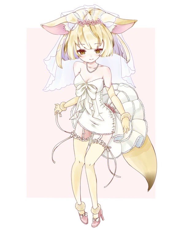 1girl alternate_costume animal_ears bare_shoulders blonde_hair blush bridal_veil commentary_request dress elbow_gloves fennec_(kemono_friends) flower fox_ears fox_girl fox_tail fur_trim gloves hair_flower hair_ornament jewelry kemono_friends megumi_222 necklace pearl_necklace pencil_dress short_hair sleeveless solo tail thighhighs veil wedding_dress white_dress white_fur yellow_eyes yellow_gloves yellow_thighhighs zettai_ryouiki