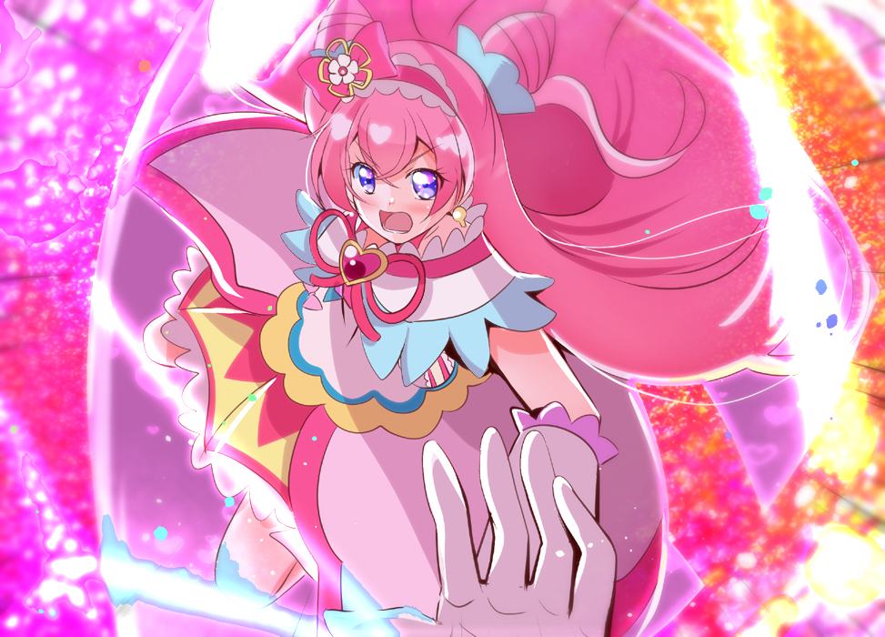 1girl apron bow brooch choker commentary_request cone_hair_bun cure_precious delicious_party_precure earrings gloves hair_bun headband heart heart_brooch jewelry long_hair magical_girl mitumi_mira nagomi_yui open_mouth pink_bow pink_choker pink_hair pink_headband precure purple_eyes solo triple_bun two_side_up very_long_hair white_gloves