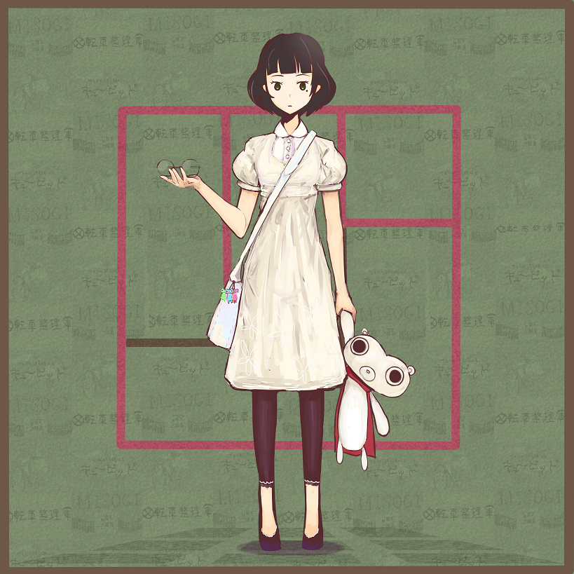 1girl accessories akashi_(yojouhan) ameya_shioichi bag bag_charm black_hair black_leggings black_pants blunt_bangs bob_cut buttons cape charm_(object) collared_shirt dress dress_shirt expressionless unworn_eyewear framed full_body glasses googly_eyes green_background green_eyes high_heels hiragana holding holding_removed_eyewear japanese_text leggings medium_dress mochiguman_(yojouhan) mole mole_under_eye pants pants_under_dress puffy_short_sleeves puffy_sleeves red_cape round_eyewear shirt shoes short_hair short_sleeves shoulder_bag sidelocks sleeve_cuffs solo standing straight-on tatami white_bag white_dress yojouhan_shinwa_taikei