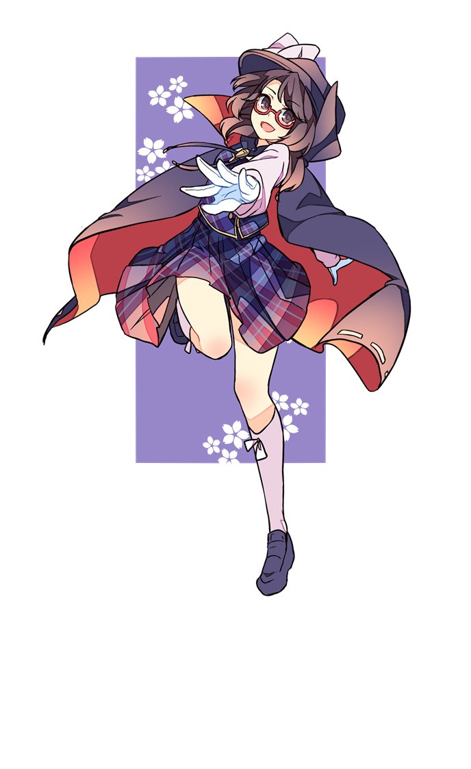 1girl adapted_costume brown_hair cloak fedora floral_background glasses gloves hat haya_taro_pochi kneehighs loafers long_sleeves low_twintails plaid_clothes plaid_skirt plaid_vest quimbaya_airplane reaching reaching_towards_viewer shoes short_hair short_twintails skirt smile socks touhou twintails usami_sumireko vest