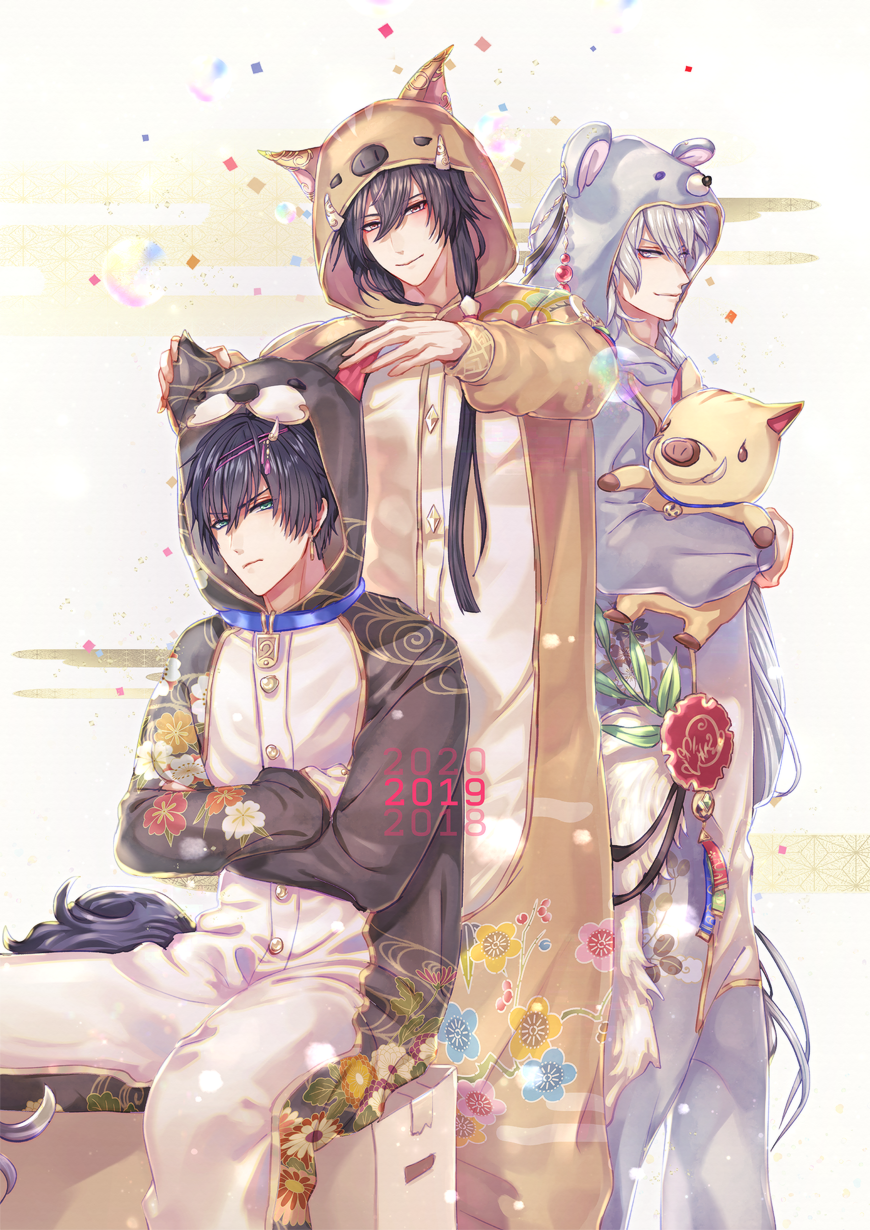 2018 2019 2020 3boys animal_hood aqua_eyes black_hair hanare_(yume-100) highres hood inui_(yume-100) long_hair looking_at_viewer male_focus multiple_boys onesie plums43 shin_(yume-100) short_hair very_long_hair white_eyes white_hair yellow_eyes yume_oukoku_to_nemureru_100-nin_no_ouji-sama