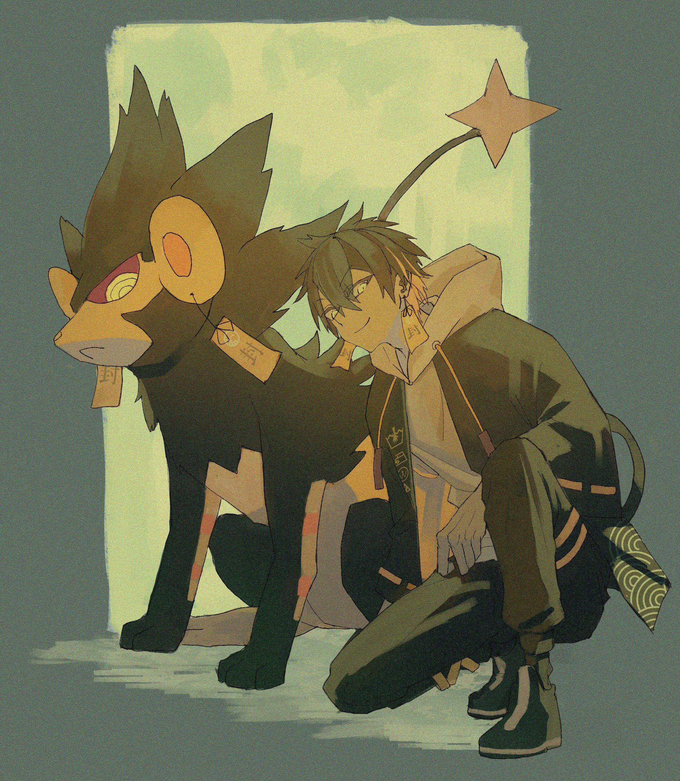 1boy absurdres alternate_color ankle_boots black_boots black_coat black_hair black_pants blonde_hair boots coat crossover drawstring earrings full_body gen_4_pokemon gensyuuu gloves green_background grey_gloves grey_hoodie hair_between_eyes highres holostars hood hood_down hoodie jewelry looking_at_viewer luxray male_focus multicolored_hair nintendo on_one_knee open_clothes open_coat pants pokemon pokemon_(creature) ribbon seigaiha shiny_pokemon short_hair smile solo thigh_strap two-tone_hair virtual_youtuber yatogami_fuma yellow_eyes yellow_ribbon