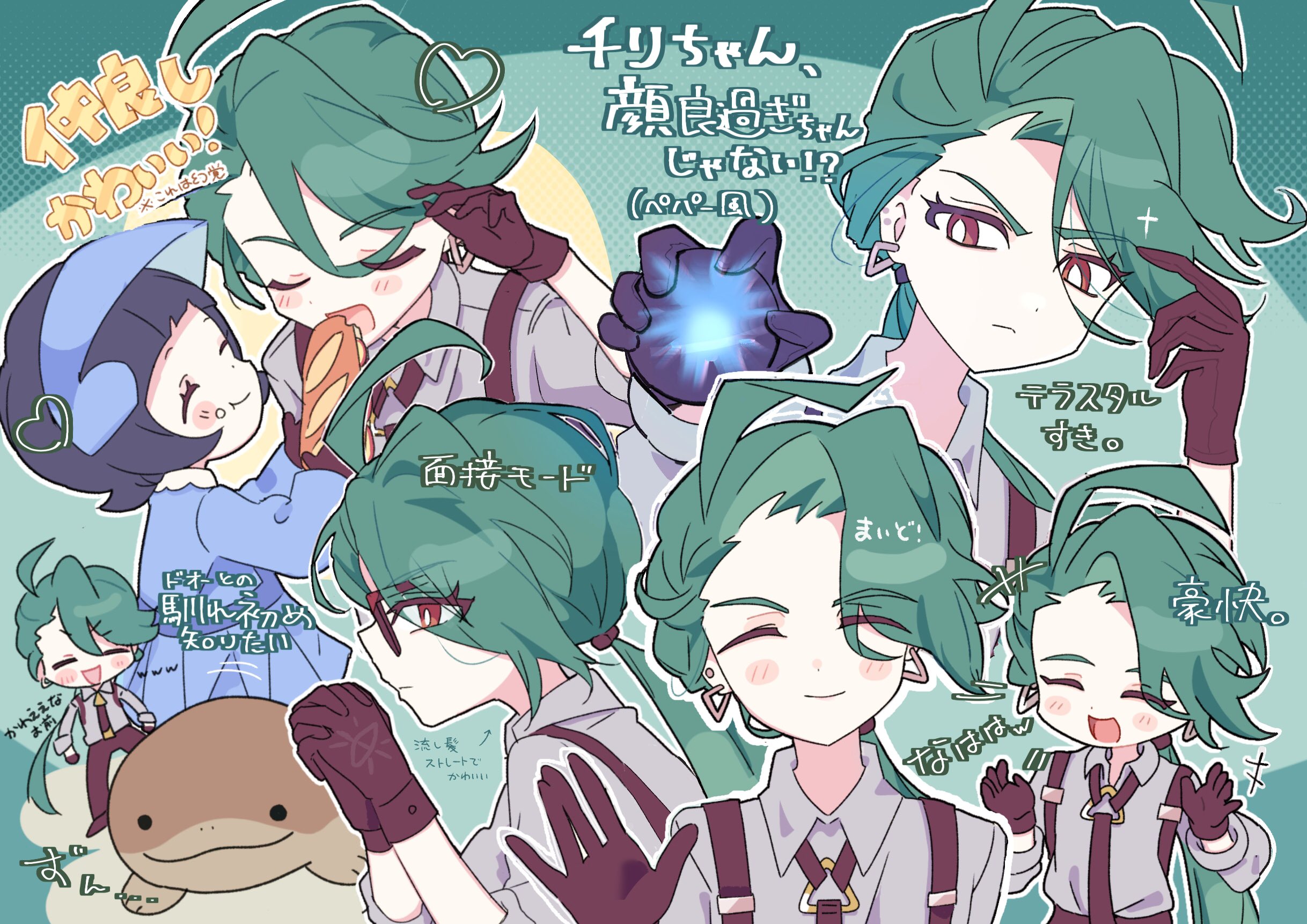 2girls 9_wapuwapu adjusting_hair black_gloves black_necktie blush_stickers bonnet bright_pupils cardigan child clodsire closed_eyes commentary ear_piercing eating eyelashes feeding food frown glasses gloves green_background green_hair hair_over_one_eye heart highres holding holding_food holding_poke_ball holding_tera_orb kansaiben long_hair multiple_girls multiple_views necktie nintendo open_mouth piercing poke_ball pokemon pokemon_sv ponytail poppy_(pokemon) reverse_trap rika_(pokemon) sandwich skirt sleeves_rolled_up smile sparkle suspenders tera_orb tomboy translated waving
