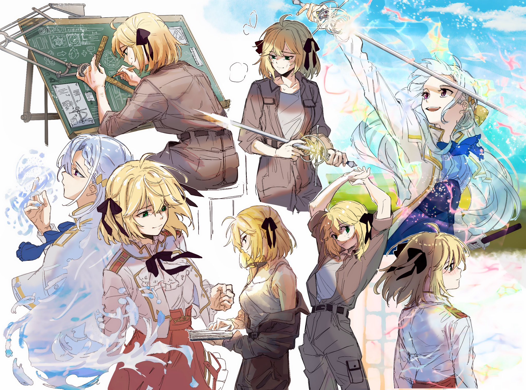 2girls anisphia_wynn_palettia arms_up black_bow blonde_hair blue_bow blue_bowtie blue_skirt blueprint_(object) blush bow bowtie braid braided_bangs brown_jumpsuit carpenter's_square closed_mouth commentary_request euphyllia_magenta gold_trim green_eyes highres jacket jumpsuit koyomania lace long_hair long_sleeves magic magic_circle medium_hair multiple_girls open_mouth paper pink_skirt pouch rapier red_eyes ruler shirt skirt sleeveless sleeveless_shirt smile sweat sword tank_top tensei_oujo_to_tensai_reijou_no_mahou_kakumei two_side_up water weapon white_hair white_jacket white_shirt writing
