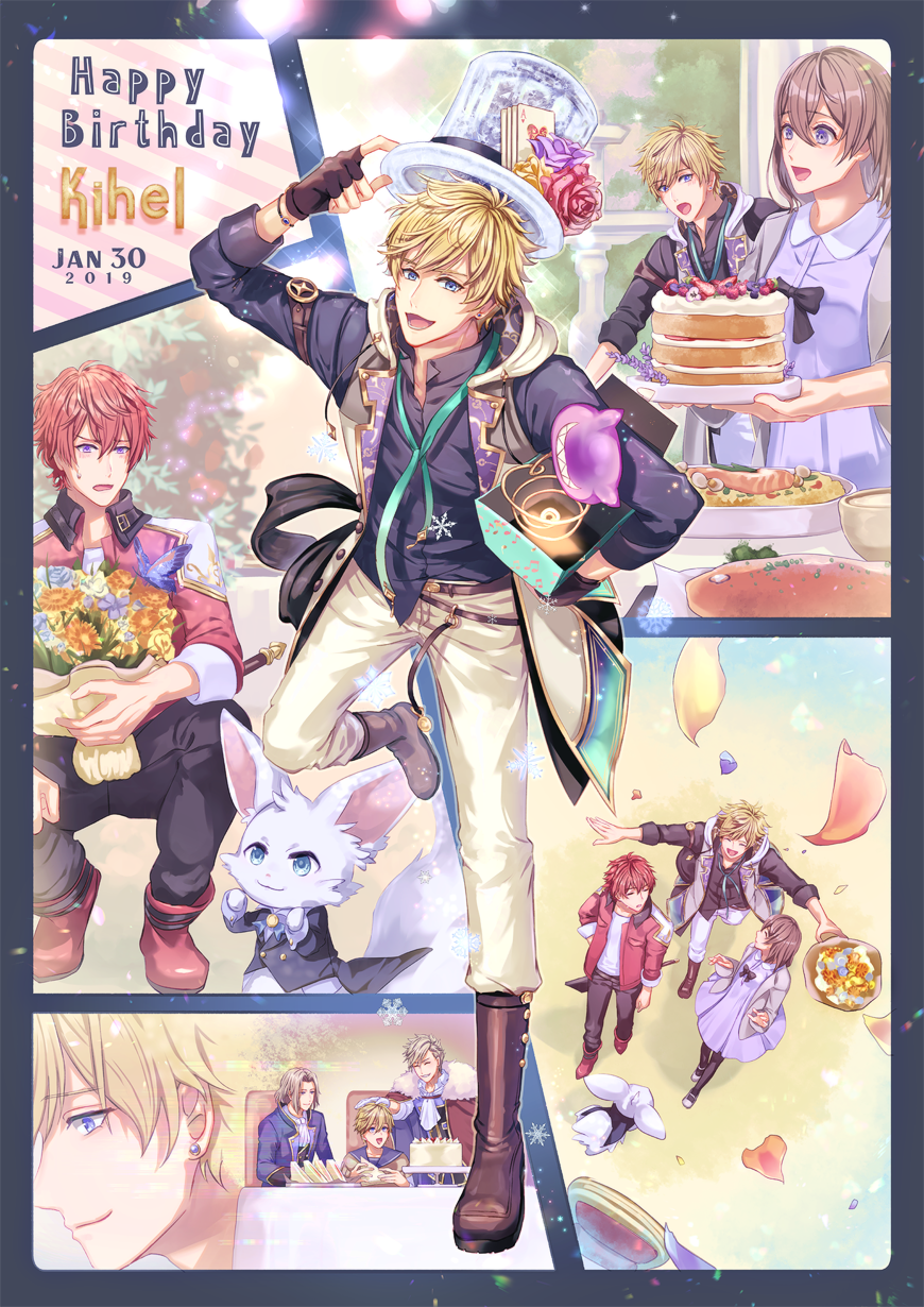 1girl 2019 5boys avi_(yume-100) blonde_hair blue_eyes brown_hair character_name character_request dated fox happy_birthday highres kihel_(yume-100) male_focus multiple_boys navi_(yume-100) plums43 purple_eyes red_hair setiq_(yume-100) shujinkou_(yume-100) white_hair yume_oukoku_to_nemureru_100-nin_no_ouji-sama