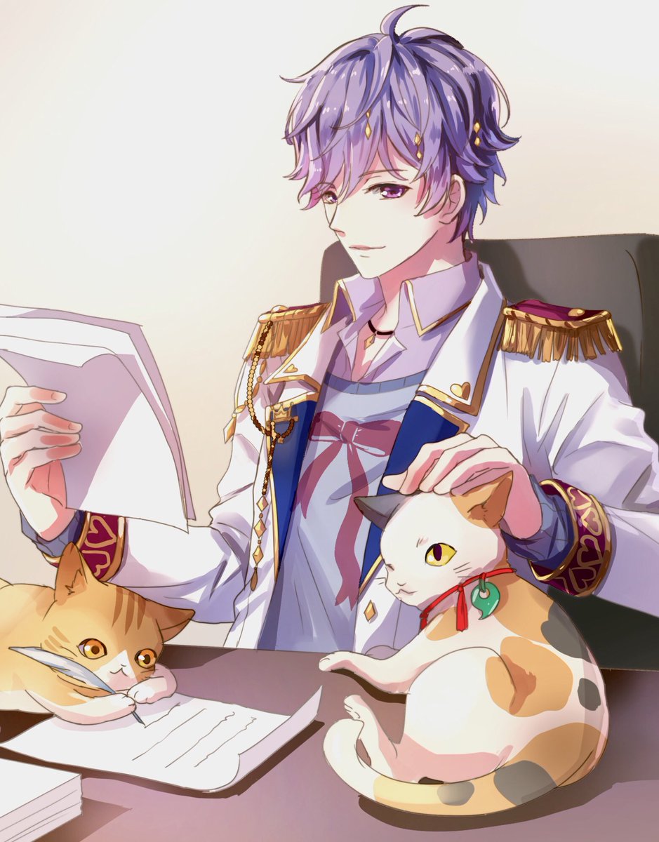 1boy blue_sweater calico_(pattern) cat collared_shirt grey_shirt highres jacket long_sleeves looking_at_viewer male_focus million_(yume-100) purple_eyes purple_hair sd_pink shirt short_hair solo sweater tabby_cat white_jacket yume_oukoku_to_nemureru_100-nin_no_ouji-sama