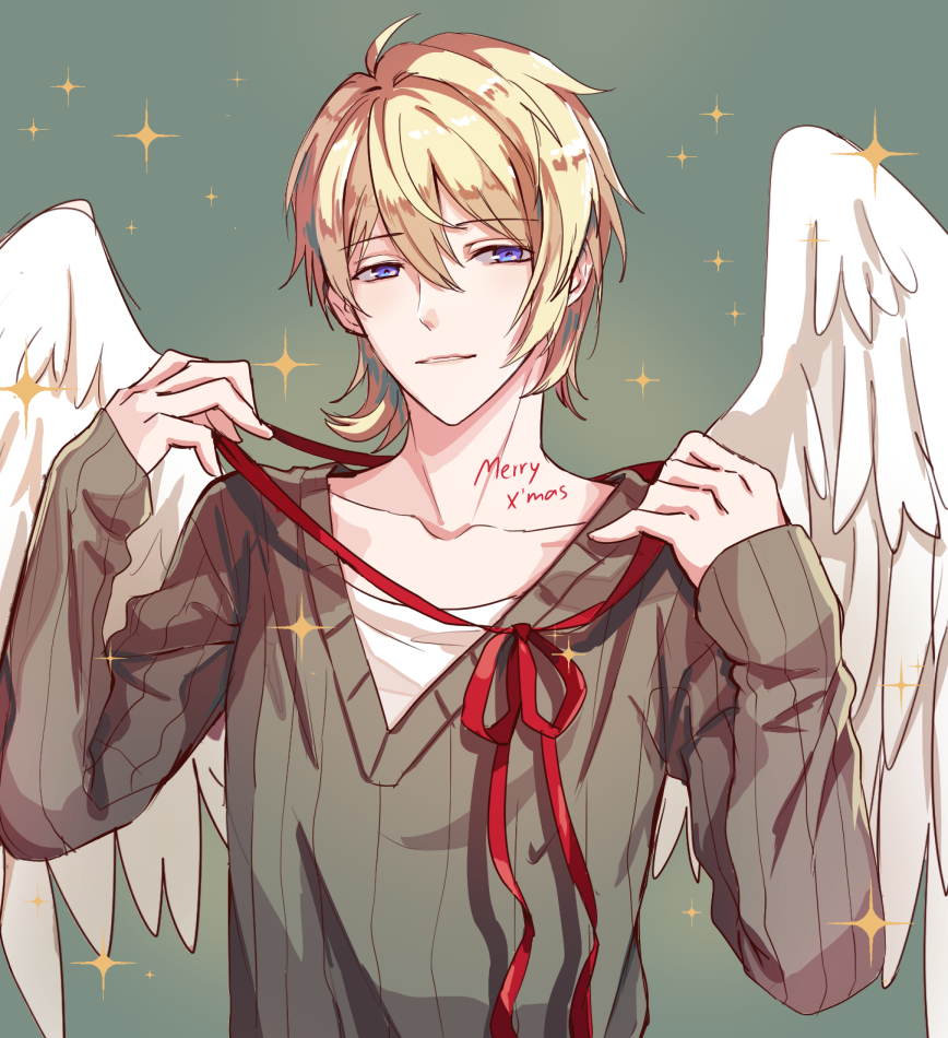 1boy angel angel_wings blonde_hair brown_sweater feathered_wings green_background long_sleeves male_focus merry_christmas micaela_(yume-100) parted_lips purple_eyes red_ribbon ribbon sd_pink smile solo sweater wings yume_oukoku_to_nemureru_100-nin_no_ouji-sama
