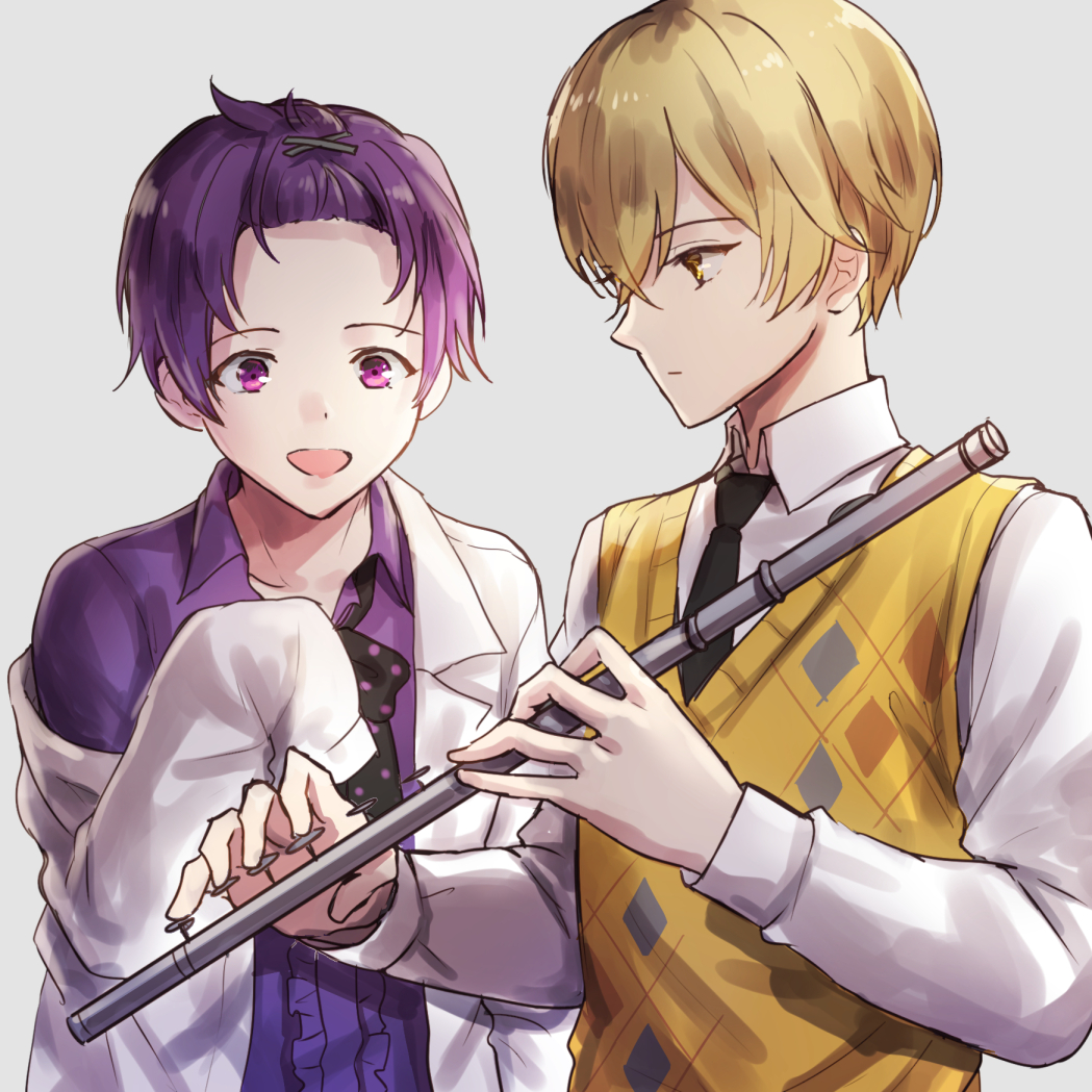 2boys apis_(yume-100) bangs_pinned_back blonde_hair collared_shirt facing_viewer holding holding_instrument instrument instrument_request lab_coat long_sleeves looking_at_another male_focus multiple_boys open_mouth orange_eyes purple_eyes purple_hair sakia_(yume-100) sd_pink shirt short_hair sketch white_shirt yume_oukoku_to_nemureru_100-nin_no_ouji-sama