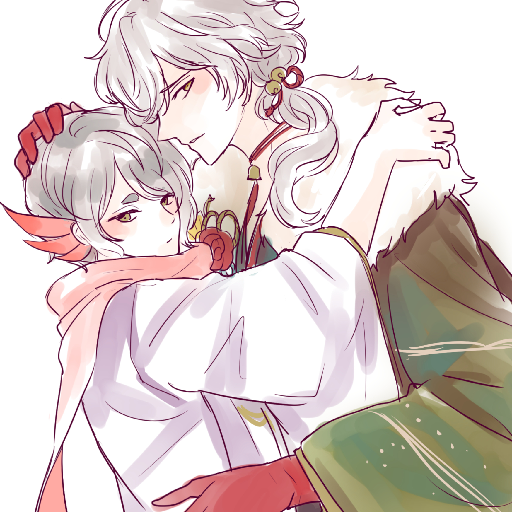 2boys feathers grey_hair highres hinoto_(yume-100) hug kanoto_(yume-100) long_hair long_sleeves looking_at_viewer male_focus multiple_boys scarf sd_pink short_hair sketch solo white_background yellow_eyes yume_oukoku_to_nemureru_100-nin_no_ouji-sama
