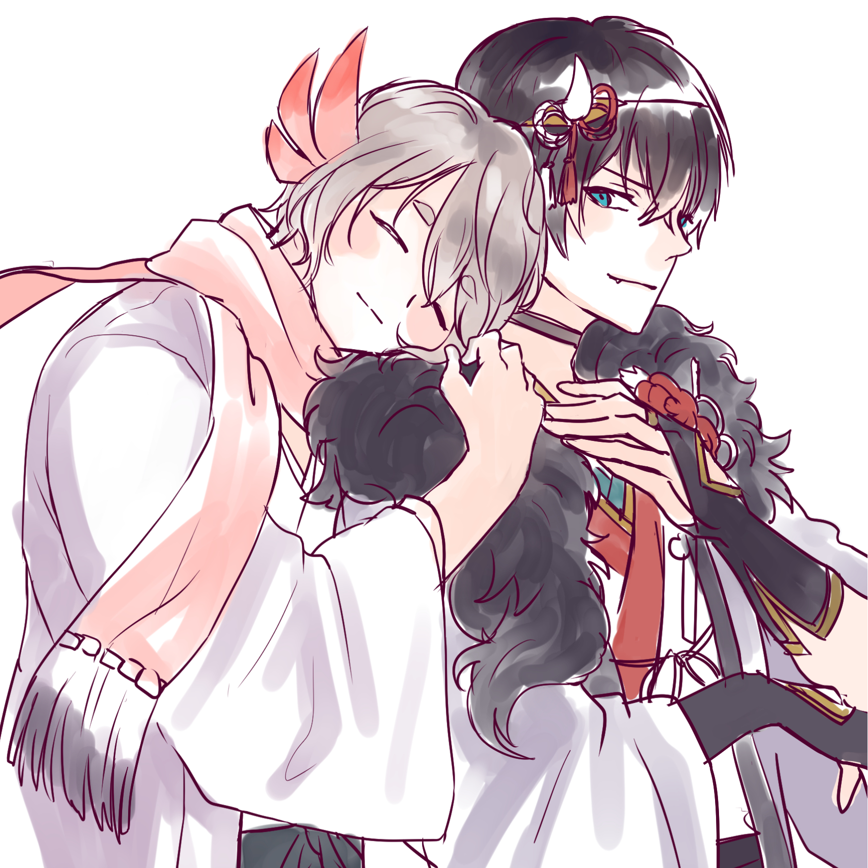 2boys androgynous black_hair blue_sky blush closed_eyes feathers grey_hair highres hug inui_(yume-100) kanoto_(yume-100) leaning_on_person long_sleeves male_focus multiple_boys sd_pink short_hair sketch sky white_background yaoi yume_oukoku_to_nemureru_100-nin_no_ouji-sama