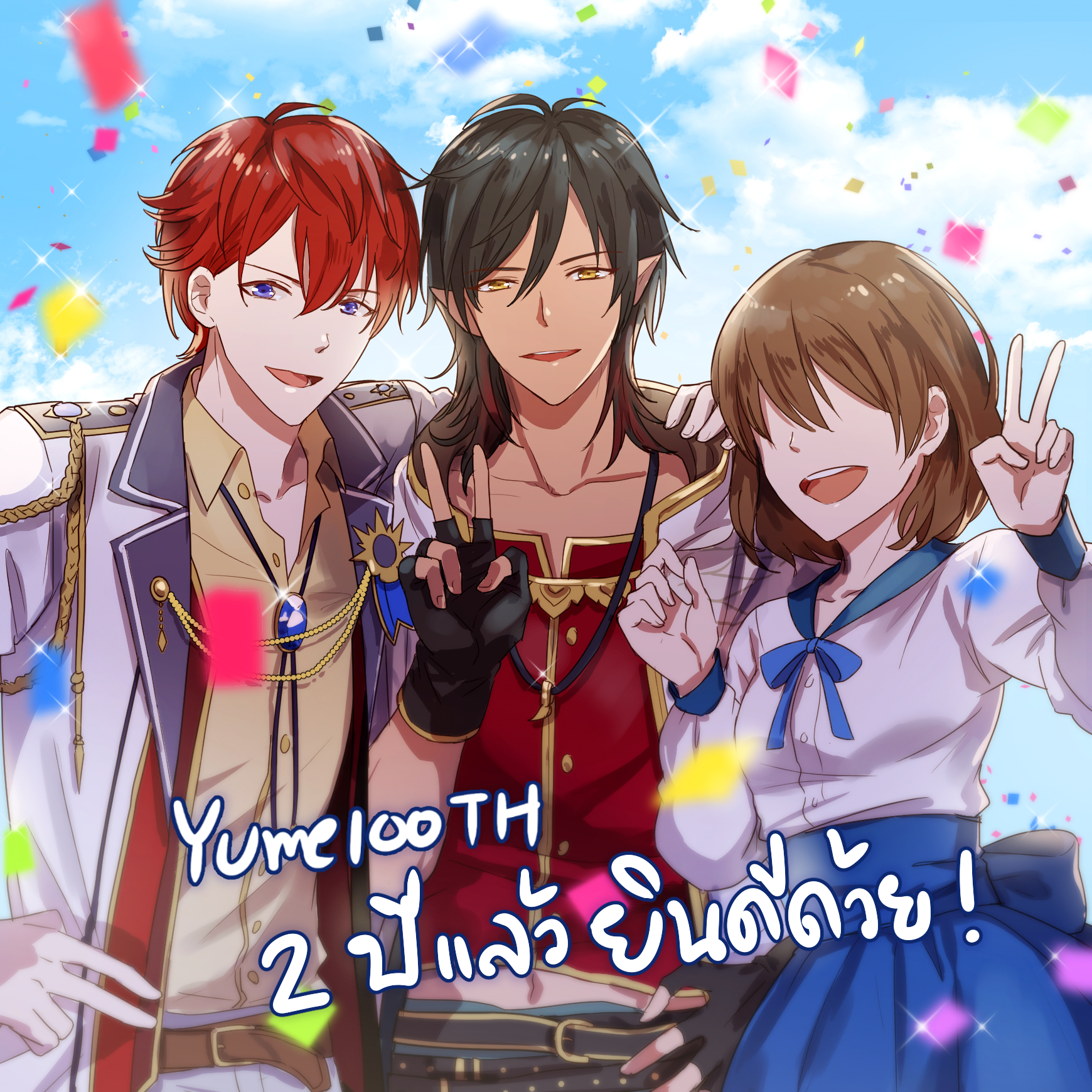 1girl 2boys avi_(yume-100) black_hair brown_hair character_request copyright_name dark-skinned_male dark_skin faceless faceless_female highres looking_at_viewer multicolored_hair multiple_boys open_mouth purple_eyes red_hair sd_pink shujinkou_(yume-100) smile translation_request yellow_eyes yume_oukoku_to_nemureru_100-nin_no_ouji-sama