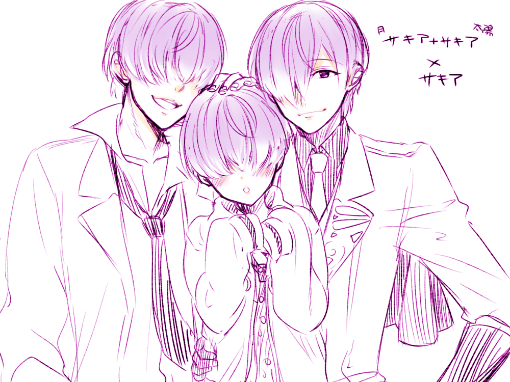 3boys blush closed_mouth hair_over_eyes kanades0u long_bangs long_sleeves looking_at_viewer male_focus multiple_boys multiple_persona open_mouth oversized_clothes partially_colored purple_eyes purple_hair sakia_(yume-100) short_hair sketch smile yume_oukoku_to_nemureru_100-nin_no_ouji-sama