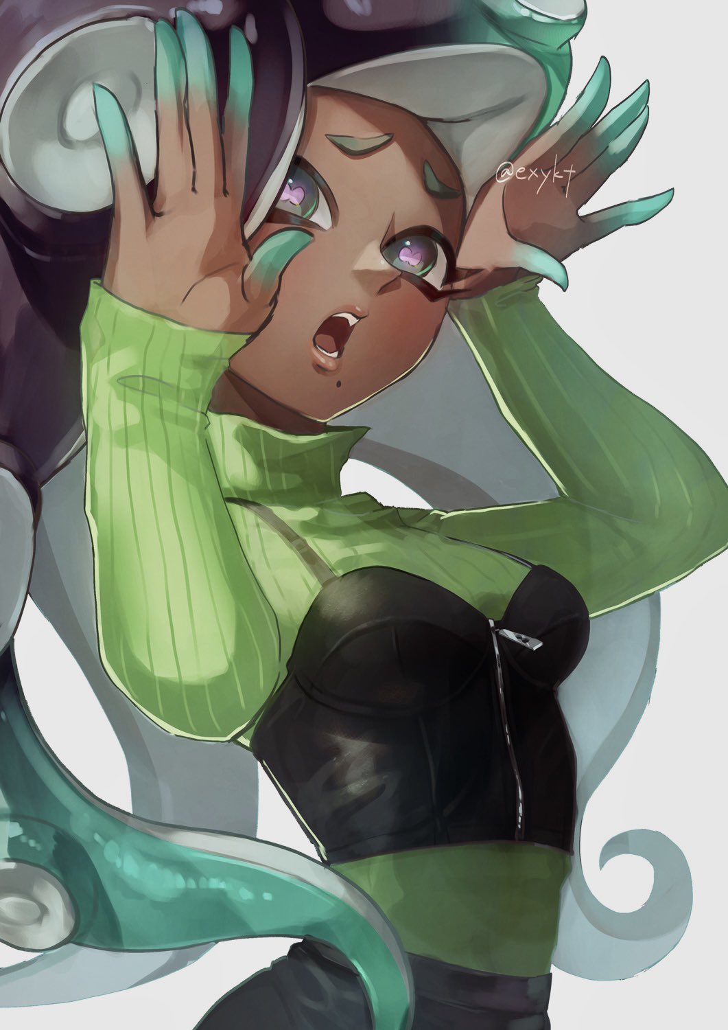 1girl breasts dark-skinned_female dark_skin green_eyes highres long_sleeves marina_(splatoon) medium_breasts nintendo octoling sizu splatoon_(series) sweater tentacle_hair
