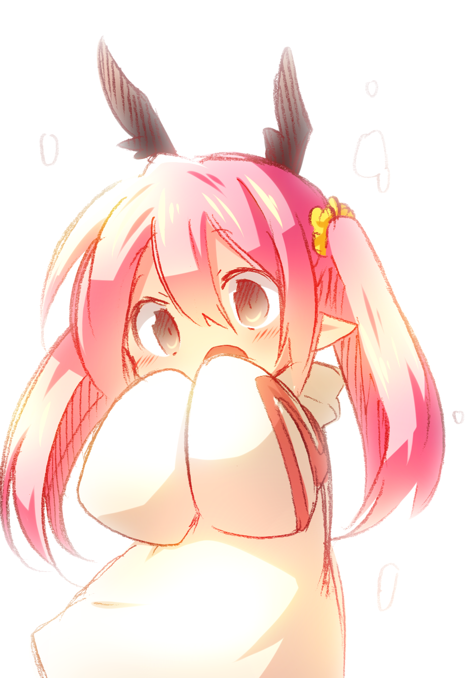 1girl aka_muffler_yamato blush head_wings highres long_sleeves pink_eyes pointy_ears purple_eyes ruki_(senyuu) sen'yuu. simple_background sleeves_past_fingers sleeves_past_wrists smile solo twintails white_background wings
