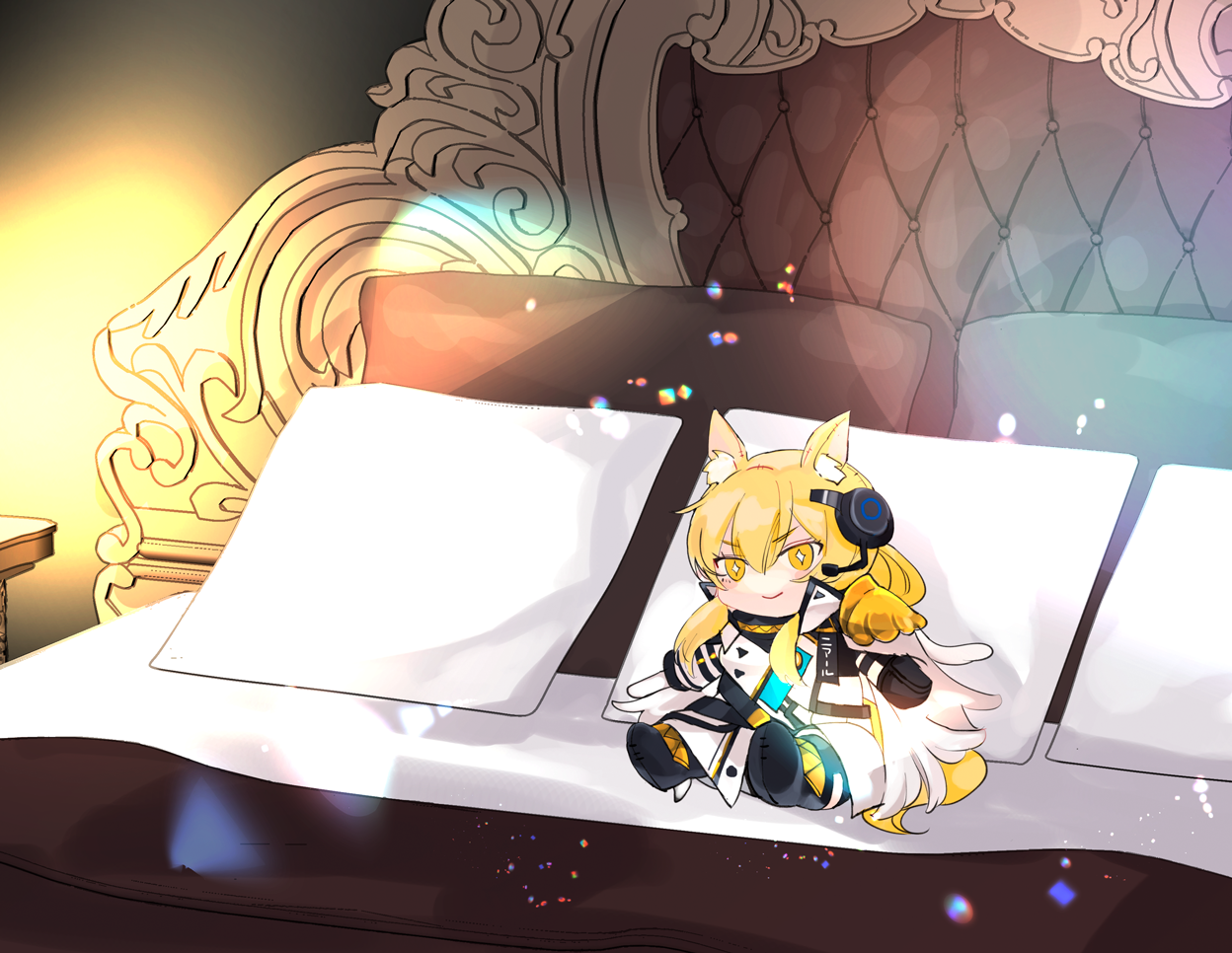 animal_ear_fluff animal_ears arknights bed bed_sheet bedroom blonde_hair coat headset horse_ears horse_girl horse_tail implied_extra_ears long_hair mosuke nearl_(arknights) nearl_the_radiant_knight_(arknights) on_bed pillow sitting stuffed_toy tail white_coat yellow_eyes