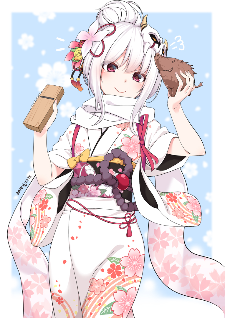 2019 blue_background boar chinese_zodiac chobipero floral_background floral_print flower hair_bun hair_flower hair_ornament hand_up happy_new_year holding japanese_clothes kannagiri_nagamitsu_(tenka_hyakken) kimono knot mask mask_on_head new_year obi oni_mask petal_print purple_eyes rope sash scarf sculpture shimenawa smile tasuki tenka_hyakken white_hair white_scarf wide_sleeves year_of_the_pig