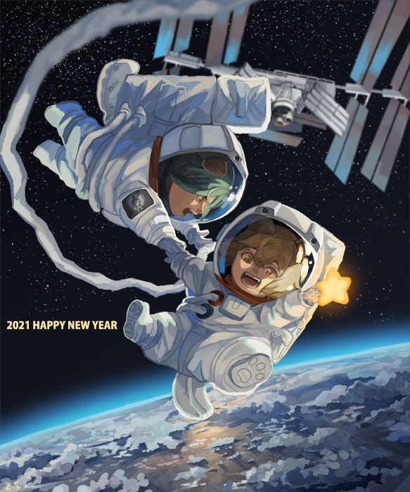 2021 2boys alternate_costume animal_ears astronaut blonde_hair chinese_commentary cloud commentary_request dated_commentary dog_boy dog_ears dog_tail earth_(planet) full_body green_hair happy_new_year helmet higekiri_(touken_ranbu) hizamaru_(touken_ranbu) looking_at_another looking_at_viewer multiple_boys new_year open_mouth planet satellite short_hair sky smile space space_helmet star_(sky) star_(symbol) starry_sky tail touken_ranbu yellow_eyes zi_tsas