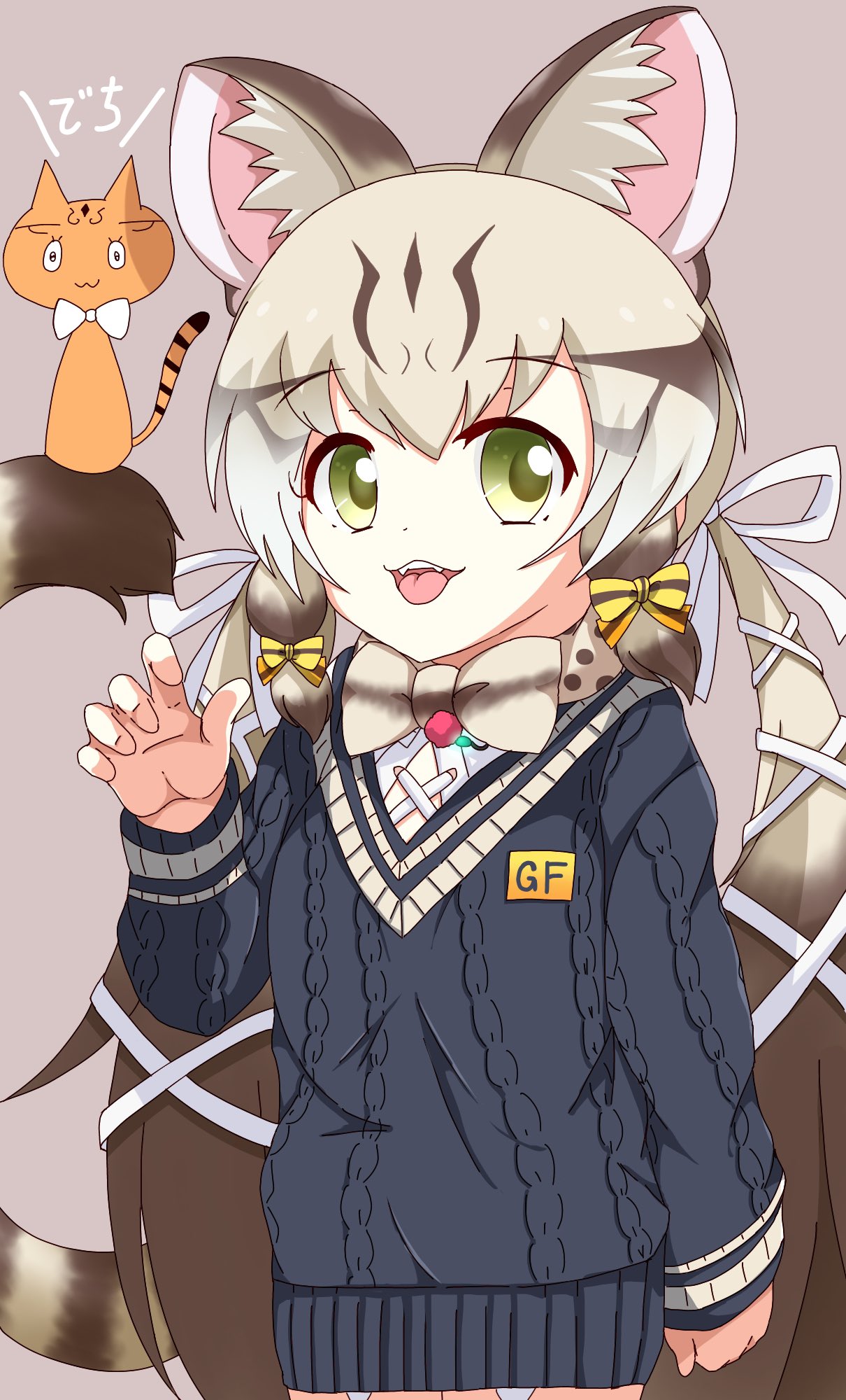 1girl animal animal_ears bow bowtie cat cat_ears cat_girl cat_tail extra_ears geoffroy's_cat_(kemono_friends) green_eyes grey_hair hata_(user_ehfr2334) highres kemono_friends kemono_friends_v_project long_hair looking_at_viewer microphone official_alternate_costume open_mouth ribbon shirt simple_background sweater tail twintails virtual_youtuber