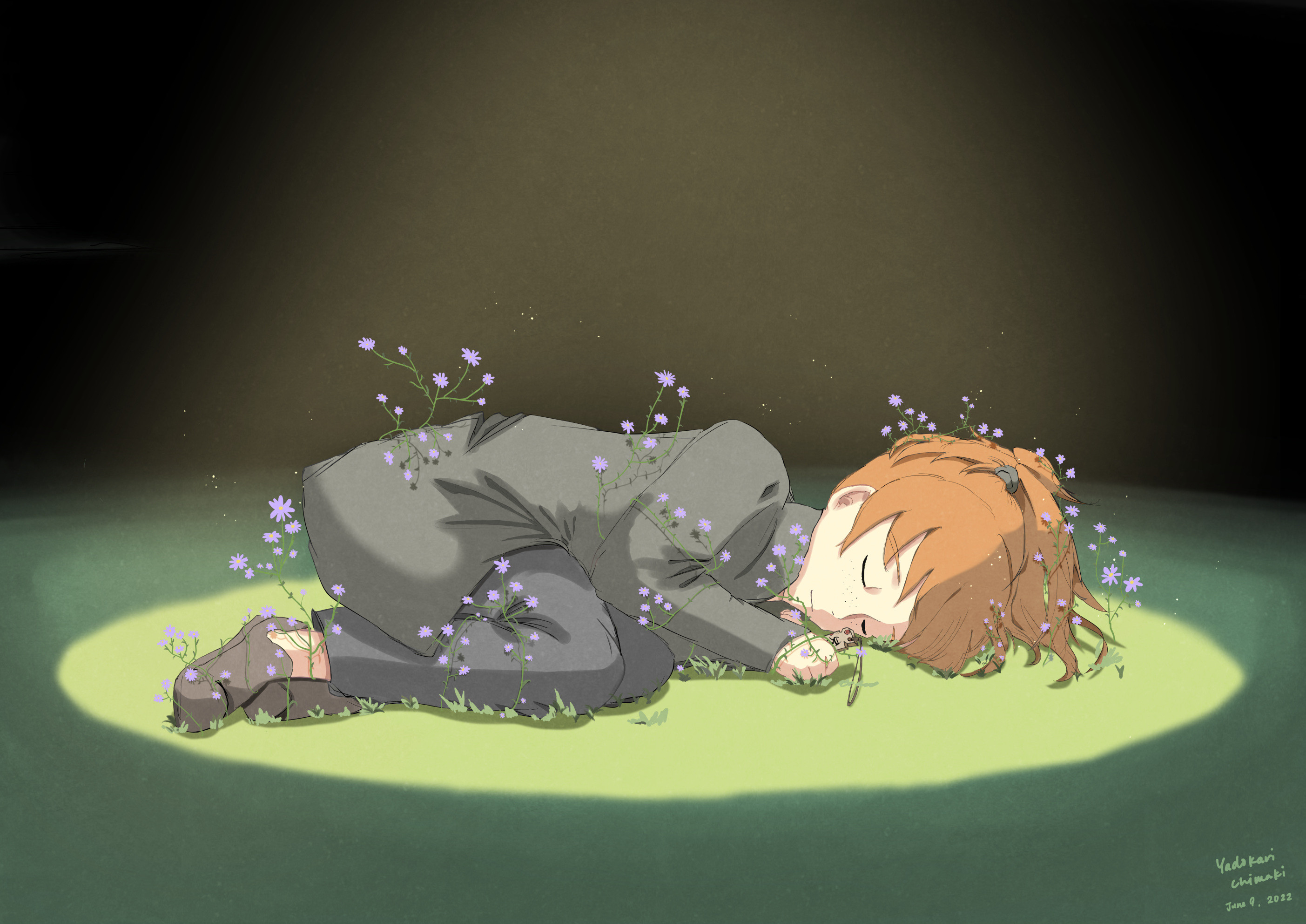 1boy artist_name black_background black_shirt black_shoes closed_eyes flower grass highres juuni_kokuki long_sleeves orange_hair plant ponytail purple_flower seishu_(juuni_kokuki) shadow shirt shoes sleeping solo spotlight wide_shot yadokari_chimaki